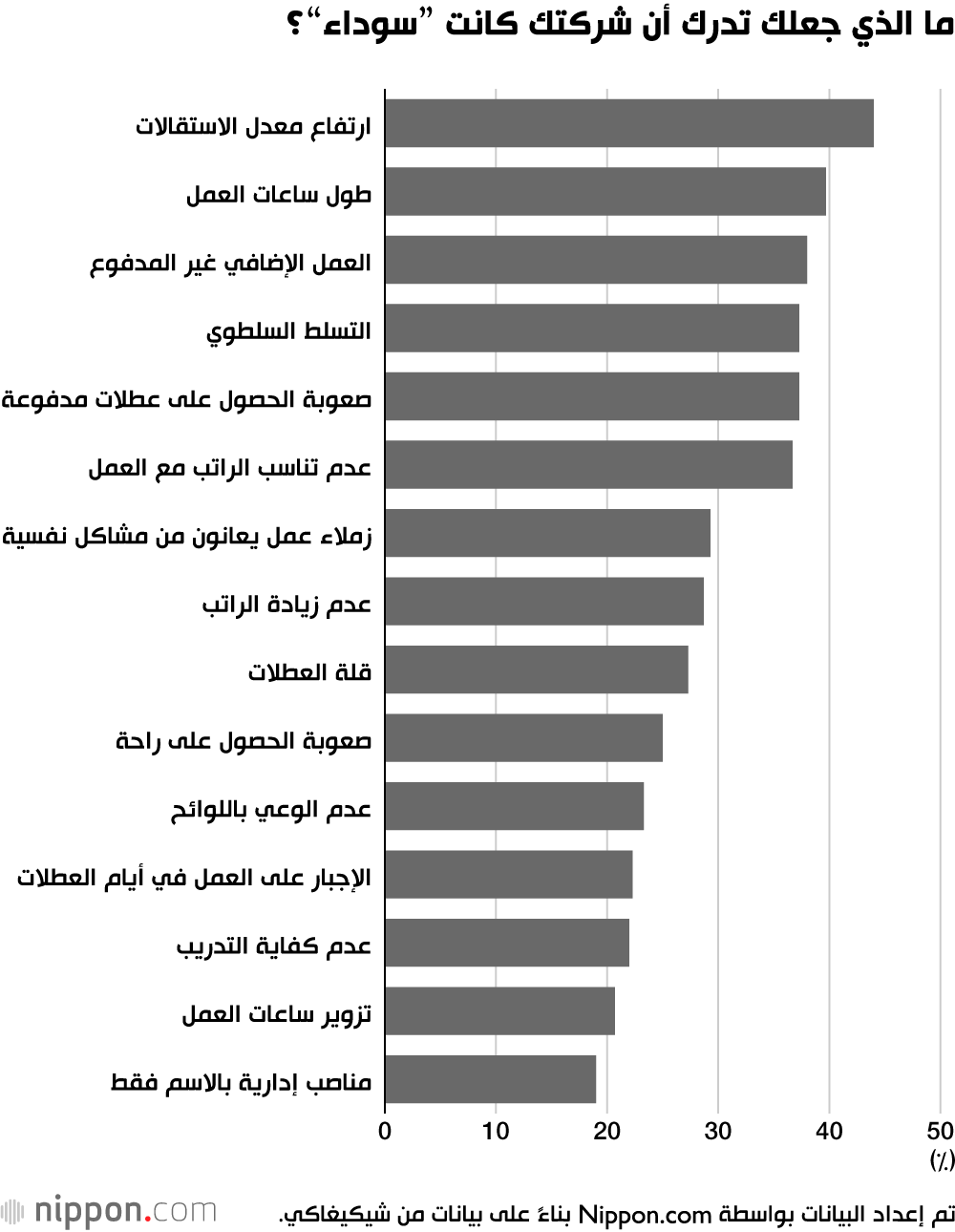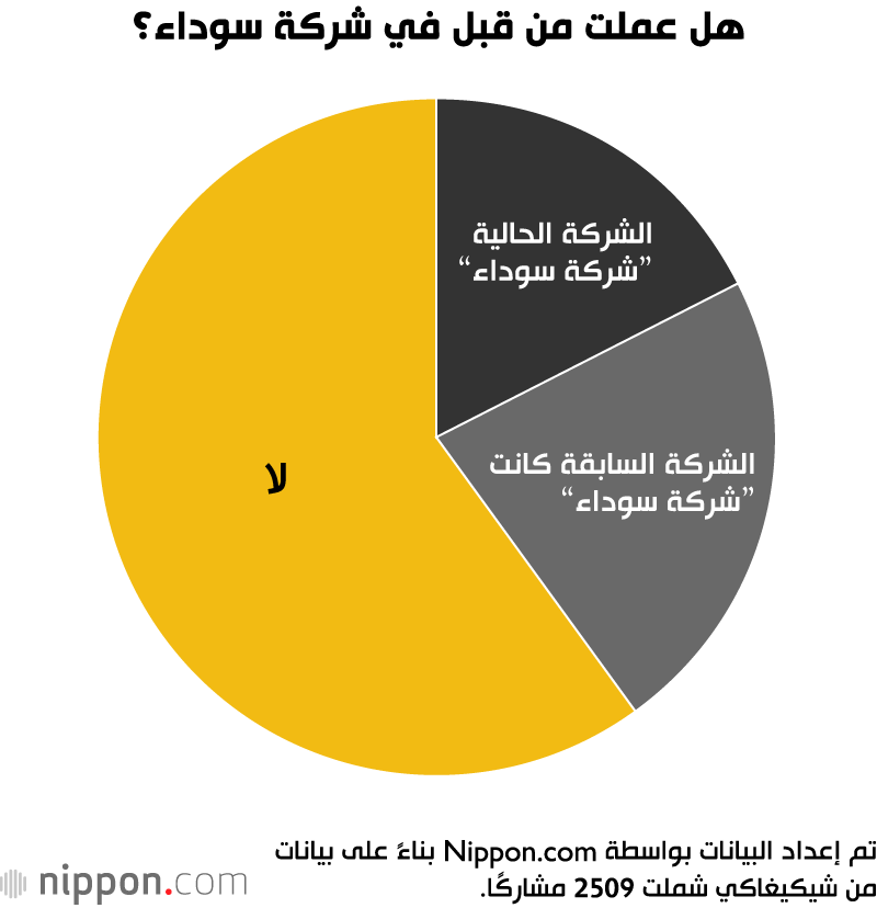 وجدت دراسة استقصائية على مستوى البلاد لموظفي الشركة الذين تتراوح أعمارهم بين 20 إلى 59 عامًا أجرتها شركة شيكيغاكو، وهي شركة خدمات استشارات إدارية مقرها طوكيو، أن 38.6% من المشاركين يقولون إنهم عملوا أو يعملون حاليًا لدى ”شركة سوداء“.