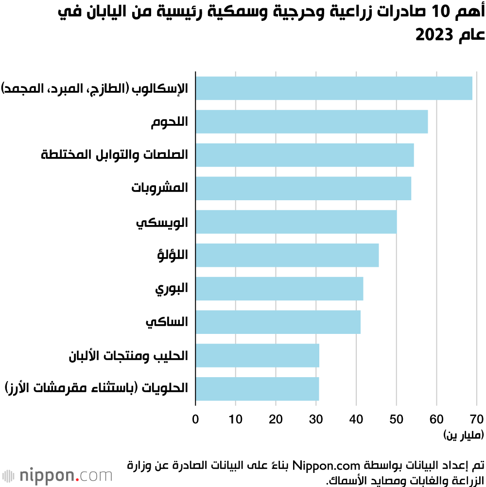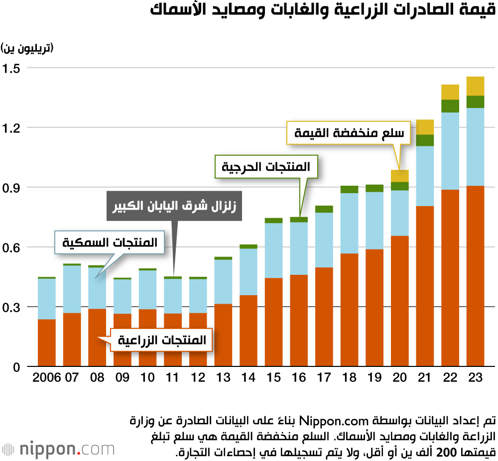 يُظهر التقرير الصادر عن وزارة الزراعة والغابات ومصايد الأسماك أن صادرات اليابان من المنتجات الزراعية والغابات والسمكية والمواد الغذائية قد ارتفعت في عام 2023 بنسبة 2.9٪ مقارنة بالعام السابق، لتصل إلى 1.45 تريليون ين. هذا الارتفاع يعد العام الحادي عشر على التوالي الذي تشهد فيه الصادرات زيادة قياسية. في النصف الأول من العام، سجلت الصادرات زيادة مطردة بنسبة 9.6٪ مقارنة بنفس الفترة من العام السابق، وذلك بفضل انتعاش الطلب من المطاعم بعد تخفيف قيود جائحة كورونا، بالإضافة إلى انخفاض قيمة الين.