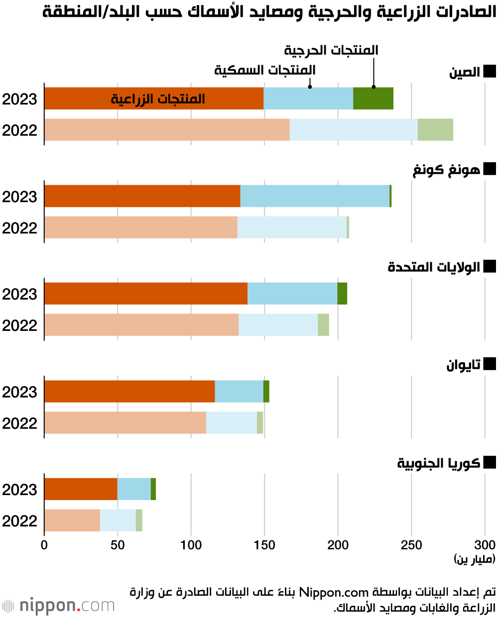 وبحسب الدولة والمنطقة، شهدت الصادرات إلى الصين انخفاضًا بنسبة 14.6% إلى 237.6 مليار ين. وإلى جانب الانخفاض في منتجات المأكولات البحرية، كانت هناك أيضًا انخفاضات في صادرات الويسكي والساكي. وفي المقابل، ارتفعت الصادرات إلى هونغ كونغ بنسبة 13.4% إلى 236.5 مليار ين، خلف الصين مباشرة. وكانت الصادرات إلى الولايات المتحدة ثابتة أيضًا، حيث نمت بنسبة 6.4% إلى 206.2 مليار ين، مدعومة بالمبيعات القوية للبوري ذو الذيل الأصفر والشاي الأخضر.