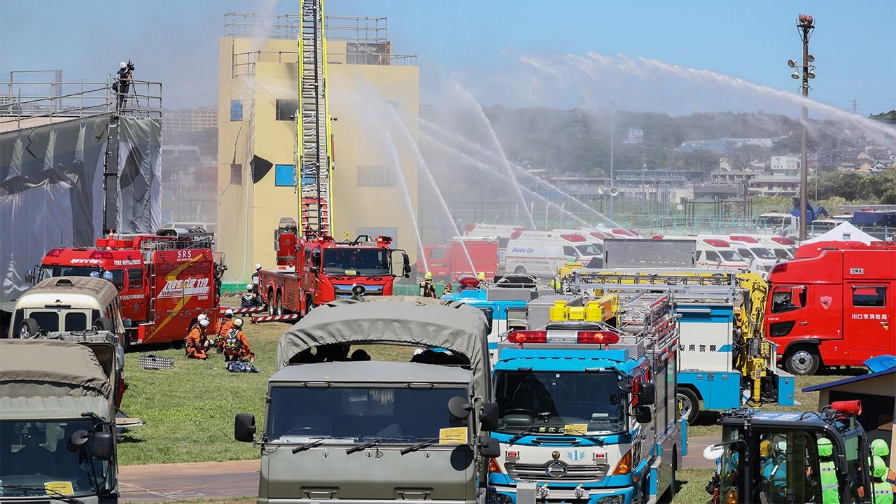 (النص الأصلي باللغة اليابانية، صورة العنوان: شاركت 9 محافظات ومدن في منطقة العاصمة، بما في ذلك محافظة طوكيو في 1 سبتمبر/أيلول 2023، ، في تدريبات السلامة والدفاع المدني التي أُقيمت في مدينة ساجامي بمحافظة كاناغاوا. © جيجي برس)