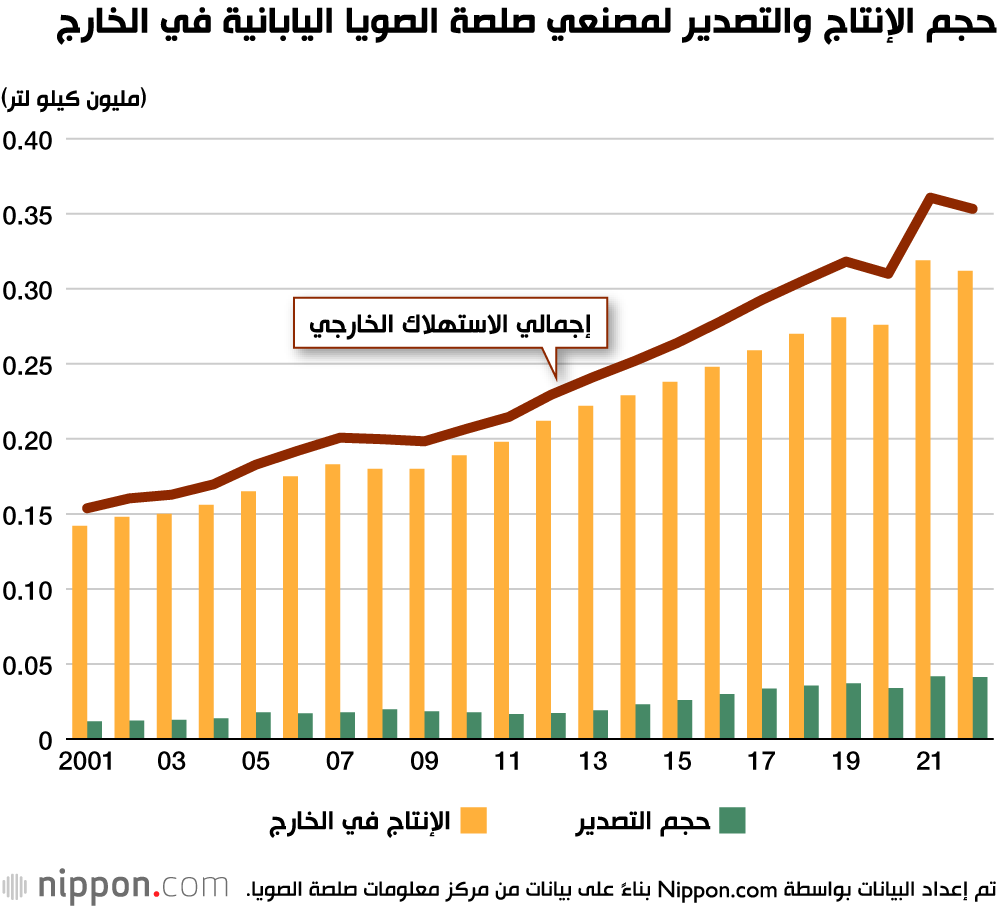 وفقًا لمركز معلومات صلصة الصويا، الذي أنشأته جمعية صلصة الصويا اليابانية وآخرون للترويج لهذه البهارات اليابانية، أنتج المصنعون اليابانيون 312 ألف كيلو لتر من صلصة الصويا في مصانعهم بالخارج في عام 2022. وإلى جانب حجم التصدير البالغ حوالي 41 ألف كيلو لتر، يتضح أن الطلب الدولي على صلصة الصويا في ازدياد. وبلغ استهلاك صلصة الصويا اليابانية داخل البلاد 353000 كيلولتر، وهو رقم يفوق حجم الحمولة القياسية لبعض أكبر ناقلات النفط.
