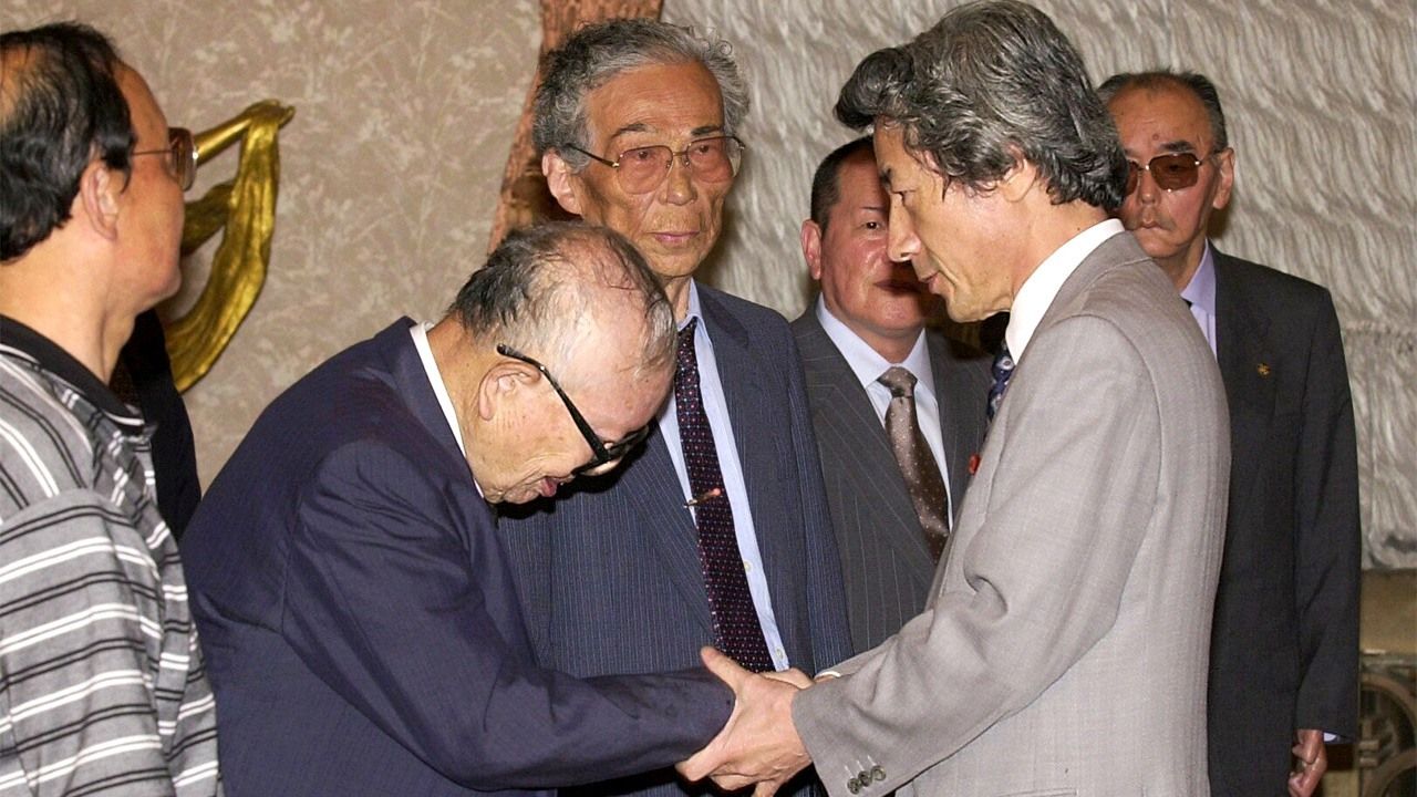 (النص الأصلي باللغة اليابانية، الترجمة من الإنكليزية. صورة العنوان: رئيس الوزراء كويزومي جونئيتشيرو (على اليمين) يحيي ممثلي المدعين في الدعوى القضائية المتعلقة بمرض الجذام في المقر الرسمي لرئاسة الوزراء في 23 مايو/ أيار 2001. © جيجي برس)
