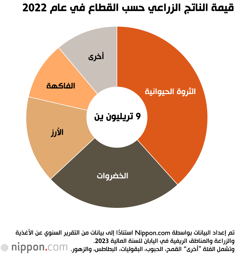 ويظهر توزيع قيمة الناتج الزراعي حسب القطاع في الرسم البياني أدناه. وتأتي الثروة الحيوانية في المقدمة بقيمة 3.5 تريليون ين (38.5%)، تليها الخضروات بقيمة 2.2 تريليون ين (24.8%)، ثم الأرز بقيمة 1.4 تريليون ين (15.5%)، والفاكهة بقيمة 0.9 تريليون ين (10.3%). وارتفع إنتاج الأرز بنسبة 1.8% من حيث القيمة على أساس سنوي مع انتعاش الأسعار بسبب انخفاض مخزونات القطاع الخاص الناتجة عن التحول عن الأرز كمحصول أساسي.
