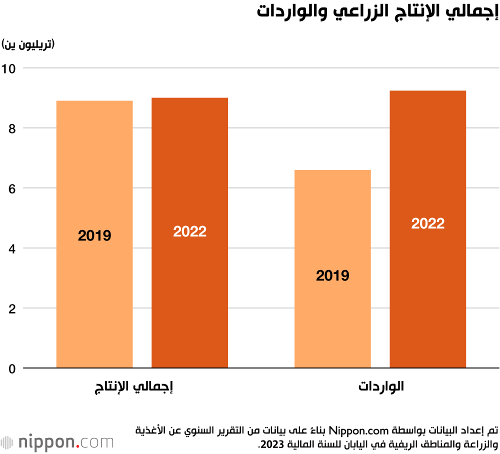 ارتفع إجمالي الإنتاج الزراعي في اليابان في عام 2022 بنسبة 1.8% عن العام السابق، ليصل إلى 9 تريليون ين، وفقًا لتقرير عن الزراعة لعام 2023 صادر عن وزارة الزراعة والغابات ومصايد الأسماك. كان الناتج الزراعي السنوي حوالي 10 تريليون ين خلال التسعينيات، لكنه انخفض إلى حوالي 9 تريليون ين في السنوات الأخيرة.