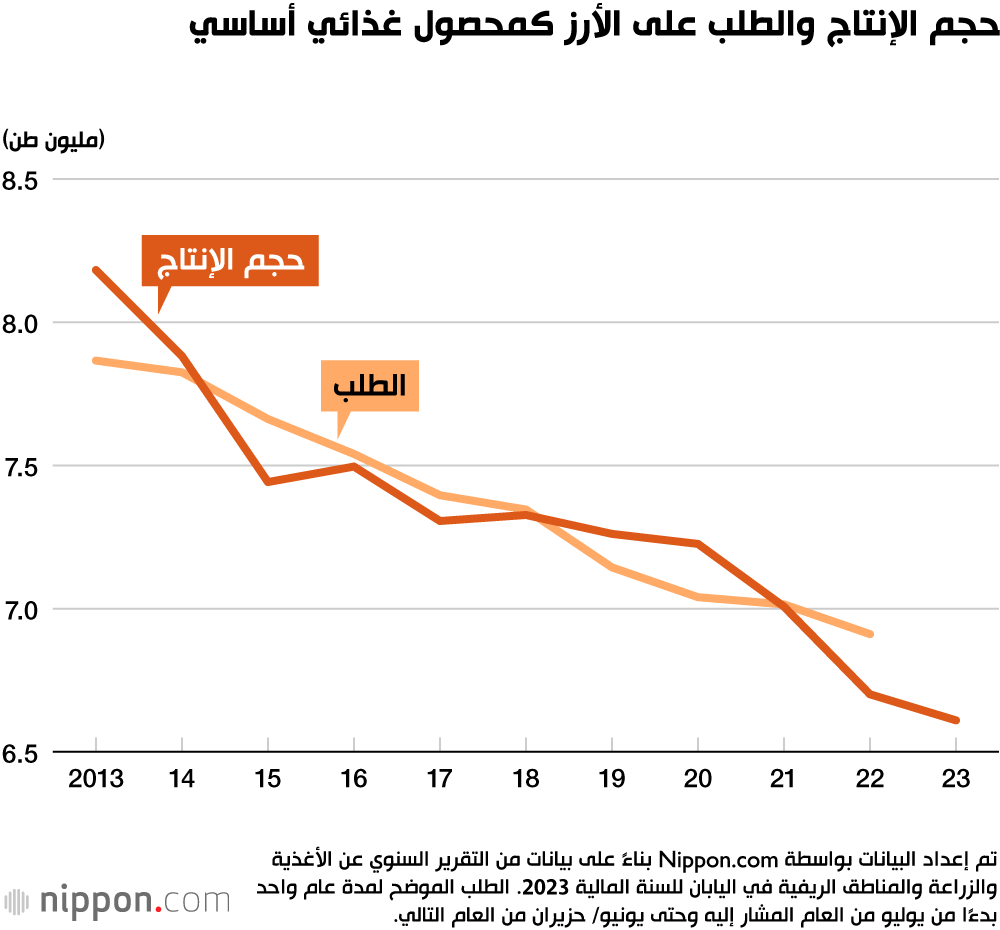 في عام 2023، بلغ إنتاج الأرز باعتباره محصولًا أساسيًا 6.6 مليون طن، بانخفاض 1.4% عن العام السابق. وبلغ إجمالي الطلب في عام 2022 ما مجموعه 6.9 مليون طن، بانخفاض يزيد عن 10% مقارنة بالعقد السابق. ونظراً لانخفاض الطلب، فقد تم استخدام الأرز بشكل متزايد في السنوات الأخيرة لإنتاج الدقيق أو علف الحيوانات.