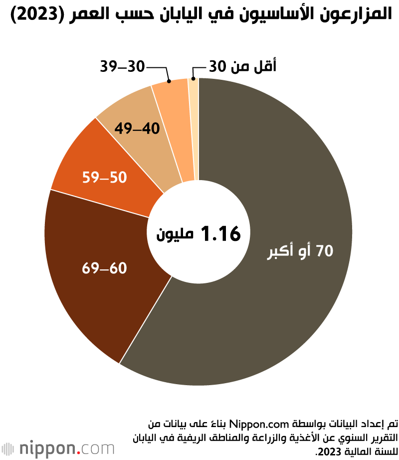 وفقًا للتقرير، بلغ إجمالي عدد ”الأشخاص الأساسيين العاملين في الزراعة بشكل رئيسي في اليابان 1.16 مليون شخص في عام 2023، أو ما يقرب من نصف العدد الذي كان عليه قبل 20 عامًا. يبلغ متوسط عمر المزارعين في اليابان 68.7 عامًا، في حين أن 10٪ فقط من المزارعين، أو 133000 مزارع، يبلغون 49 عامًا أو أقل.