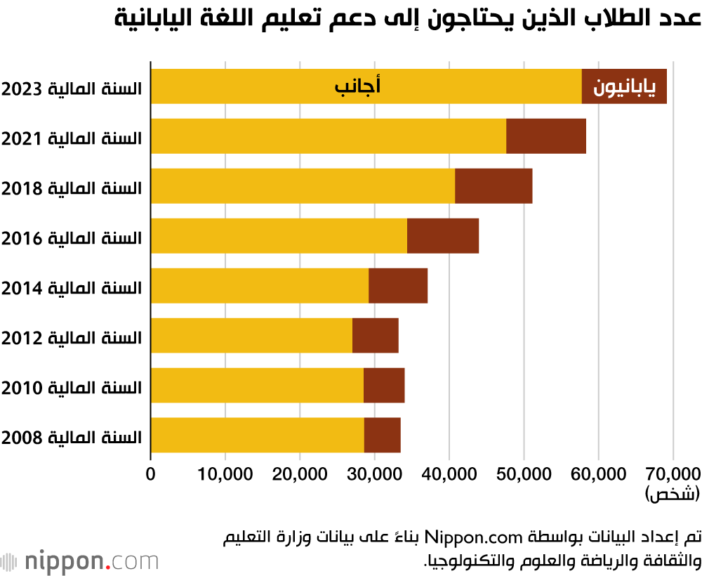 بلغ عدد الطلاب في المدارس الابتدائية والإعدادية والثانوية في اليابان الذين يحتاجون إلى مساعدة في اللغة اليابانية نحو 69,123 طالبًا في عام 2023. يعود السبب في ذلك إما لولادتهم في الخارج أو لأن والديهم من غير الناطقين باللغة اليابانية. يأتي هذا وفقًا لمسح أجرته وزارة التعليم والثقافة والرياضة والعلوم والتكنولوجيا كل عامين، والذي أظهر زيادة بنسبة 18.6% عن المسح السابق في عام 2021، حيث تم تسجيل 58,307 طلاب، وأكثر من ضعف العدد المسجل في عام 2008، والذي كان 33,470 طالبًا.