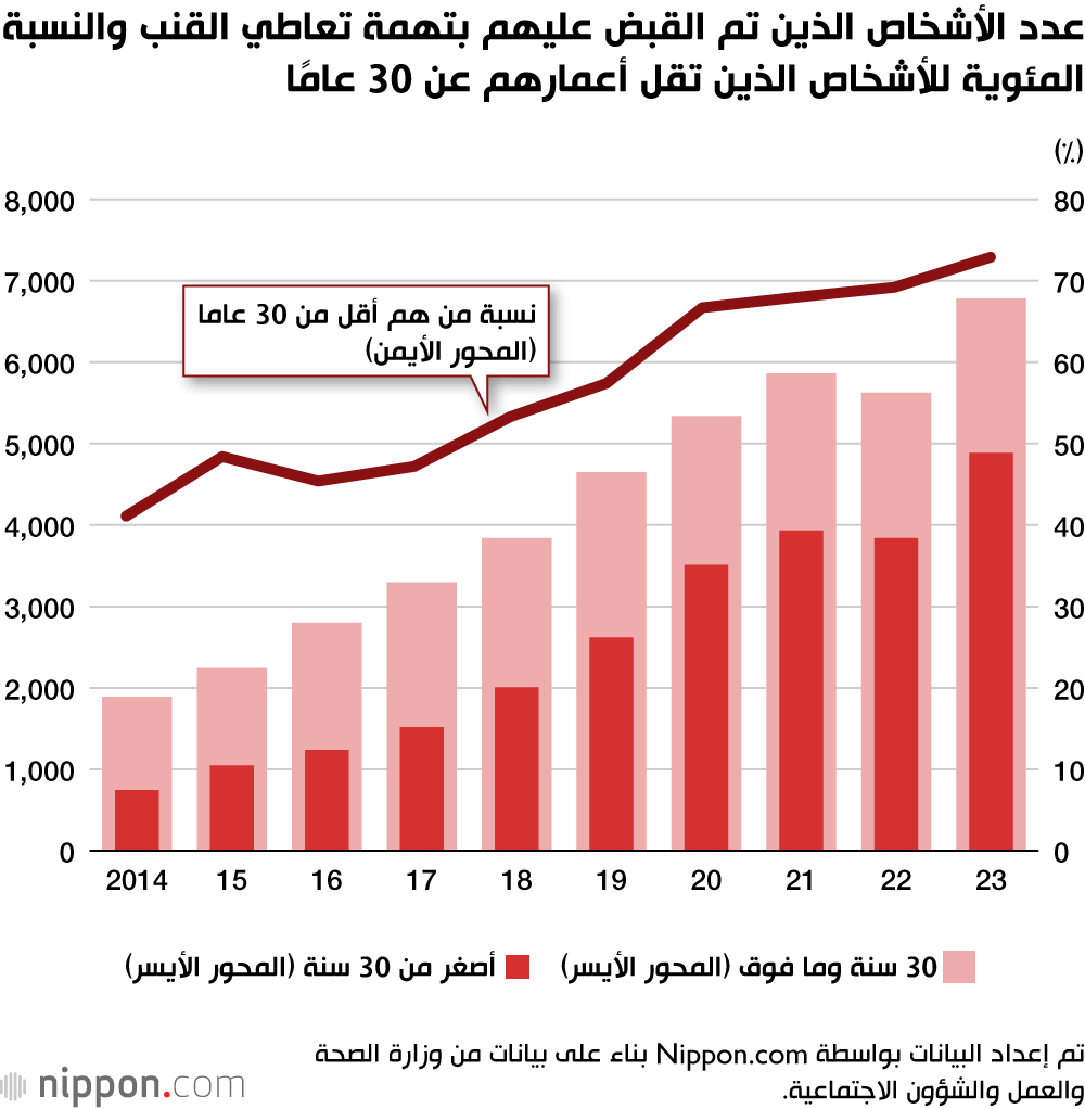 شهد عدد مرتكبي الجرائم المتعلقة بالحشيش في اليابان في عام 2023 ارتفاعًا كبيرًا مقارنة بالسنوات السابقة، حيث كان أعلى بمقدار 3.7 مرة مما كان عليه في عام 2014. ويبرز هذا الارتفاع بشكل أكبر بين الفئات الشابة، إذ ارتفع العدد بمقدار 6.6 مرة لأولئك تحت سن الثلاثين، وبشكل مقلق، ارتفع بمقدار 15.6 مرة بين من هم تحت سن العشرين. هذه الأرقام تعكس بوضوح تزايد انتشار تعاطي الحشيش بين الشباب الياباني، وهو ما يثير قلقًا كبيرًا لدى السلطات والمجتمع على حد سواء.