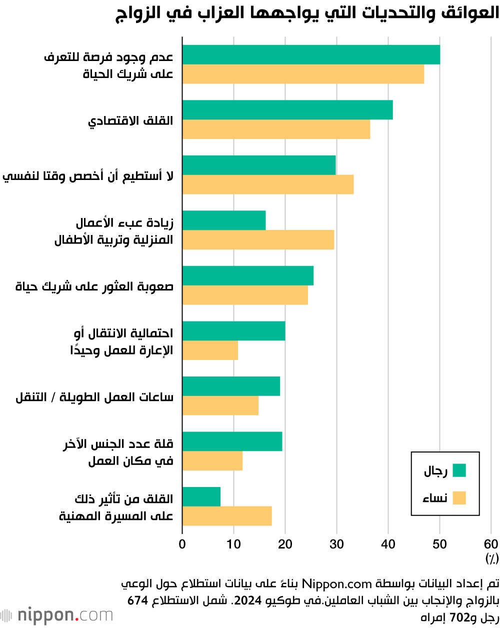 في أحدث استطلاع أجرته غرفة تجارة طوكيو حول الوعي بالزواج والإنجاب بين الشباب العاملين في العاصمة اليابانية، كشف التقرير أن 78.7٪ من العزاب يخططون للزواج في المستقبل. ومع ذلك، أشار الاستطلاع إلى أن ”عدم وجود فرص جيدة للتعرف على شريك“ يعد العقبة الرئيسية التي تواجههم، حيث قال 50.1٪ من الرجال و47.0٪ من النساء إنها أكبر تحدٍ. والأكثر إثارة للقلق هو أن هذه المشكلة تفوق ”القلق الاقتصادي“ كعائق، حيث أشار 40.9٪ من الرجال و36.5٪ من النساء إلى المخاوف المالية كعائق محتمل عند التفكير في إنجاب الأطفال.