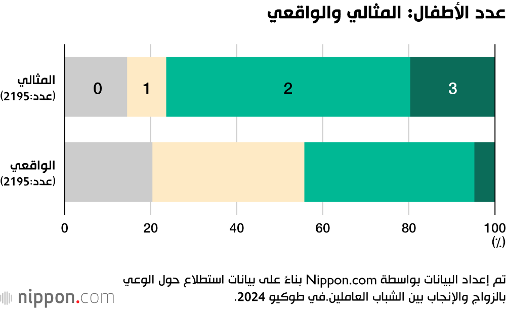 فيما يتعلق بالإنجاب، عبّر 76.4% من المشاركين عن تفضيلهم إنجاب طفلين أو أكثر. لكن 44.2% فقط يعتقدون أن هذا الأمر ممكن فعليًا في حياتهم. في المقابل، أفاد 55.7% أنهم يتوقعون إنجاب ”طفل واحد أو لا شيء“.
