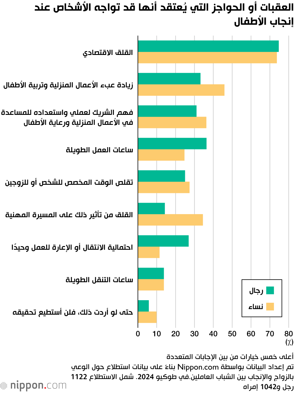 عند التفكير في إنجاب الأطفال، يُعتبر ”القلق المالي“ هو العقبة الأكبر بنسبة 74.1%، متفوقاً بشكل كبير على باقي العوامل. بينما تزيد نسبة ”زيادة العبء الناتج عن الأعمال المنزلية ورعاية الأطفال“ بين النساء، تبرز ”ساعات العمل الطويلة“ و”احتمالية الانتقال أو التعيين في مناطق بعيدة“ كعقبات رئيسية بين الرجال، مما يعكس الوعي بدور الجنسين في هذه المجالات. كما أن ”القلق من تأثير ذلك على المسيرة المهنية“ يظهر بشكل أكبر بين النساء مقارنة بالرجال.