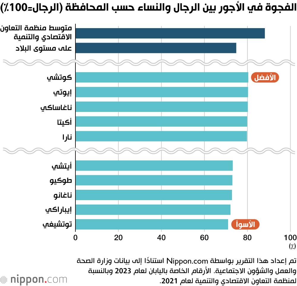 تسلط بيانات الحكومة اليابانية الضوء على الوضع النسبي للكسب للرجال والنساء في القوى العاملة. وقد قدمت وزارة الصحة والعمل والشؤون الاجتماعية أحدث تصنيف إلى جانب مواد أخرى إلى اجتماع فريق مشروع حكومي لتعزيز التقدم المهني للمرأة. تم تجميع النتائج المتعلقة بالفجوة في الأجور على أساس الجنس من دراسة أجريت في عام 2023، والتي تظهر أجور النساء كنسبة مئوية من أجور الرجال (مع الإشارة إلى التكافؤ الكامل بنسبة 100٪).