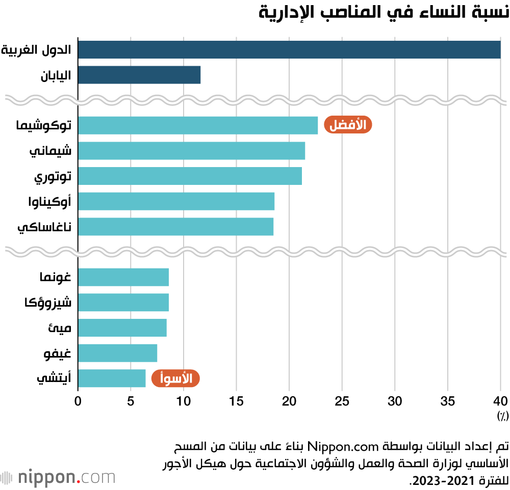 وتتخلف اليابان كثيراً عن بقية الدول من حيث نسبة النساء في المناصب الإدارية، حيث تبلغ 11.6%، مقارنة بنحو 40% في الدول الغربية. أما أسوأ المحافظات من حيث نسبة النساء في المناصب الإدارية فهي محافظة أيتشي، حيث تبلغ نسبة النساء في المناصب الإدارية 6.4%، تليها غيفو وميئ وشيزوؤكا.