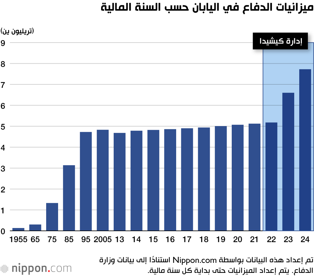 ومع ذلك، شهدت السنة المالية 2023 ارتفاعًا ملحوظًا في نفقات الدفاع إلى 6.6 تريليون ين، واستمرت الزيادة في السنة المالية 2024 لتصل إلى 7.7 تريليون ين. وإذا تم احتساب النفقات المتعلقة بالأشغال العامة والبحث العلمي والتكنولوجي التي يمكن استخدامها لأغراض أمنية، فإن إجمالي ميزانية الدفاع لعام 2024 يصل إلى 8.9 تريليون ين، أي ما يعادل 1.6% من الناتج المحلي الإجمالي الياباني.
