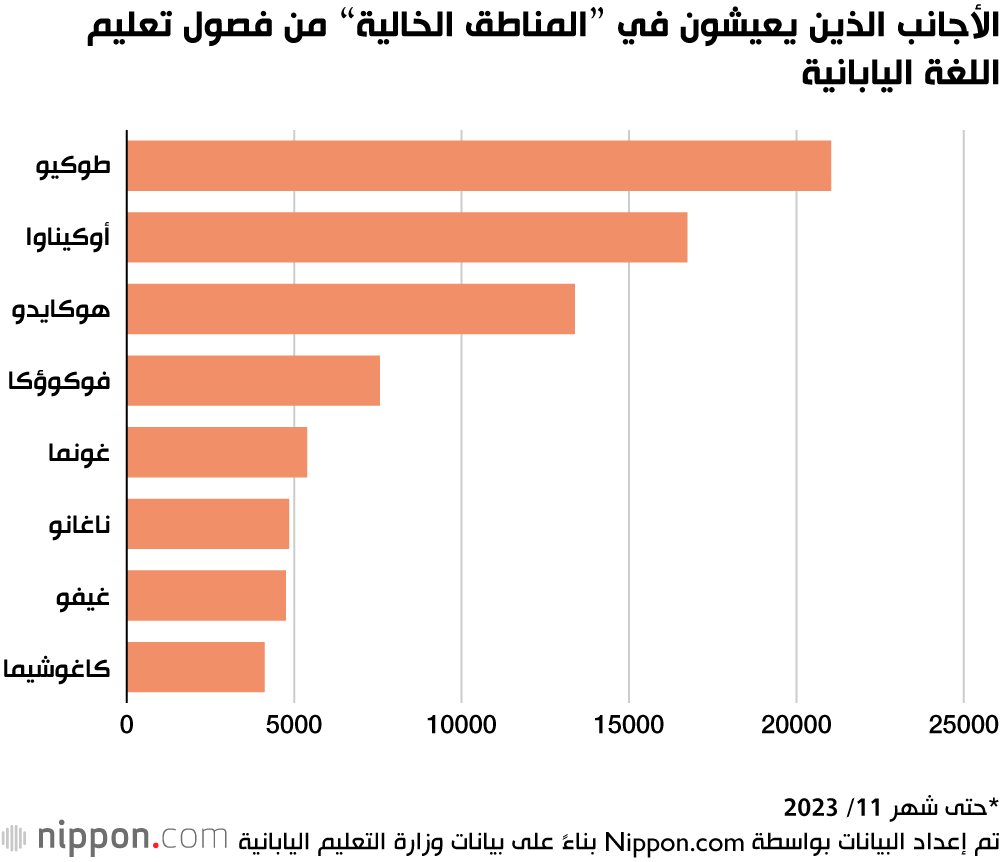 أفادت الإحصاءات الأخيرة بأن عدد الأجانب الذين يعيشون في المناطق الخالية من فصول تعليم اللغة اليابانية في اليابان قد بلغ 141,309 شخصًا. تصدرت طوكيو القائمة بعدد 21,039 أجنبيًا، مما يمثل زيادة ملحوظة بمقدار 4.7 ضعف مقارنة بالعام السابق، حيث كان العدد 4,509. تلتها كل من أوكيناوا و هوكايدو، ما يُشير إلى أن تزايد أعداد الأجانب لم يتزامن مع تجهيزات كافية لمدارس تعليم اللغة اليابانية في بعض البلديات.