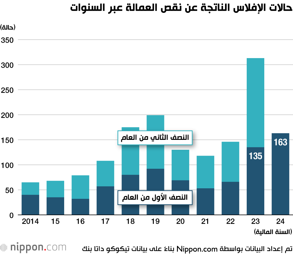 وفقاً لدراسة أجرتها مؤسسة تيكوكو داتا بنك، تم تسجيل 163 حالة إفلاس بسبب نقص العمالة في النصف الأول من العام المالي 2024 (من أبريل/ نيسان إلى سبتمبر/ أيلول). هذا الرقم تجاوز ما تم تسجيله في نفس الفترة من العام المالي 2023، الذي كان حينها أعلى مستوى على الإطلاق. وبناءً على هذا الاتجاه، يُتوقع أن يصل عدد حالات الإفلاس إلى 326 حالة بنهاية العام المالي 2024، مما يشير إلى احتمال تجاوز الأرقام القياسية للعام السابق.