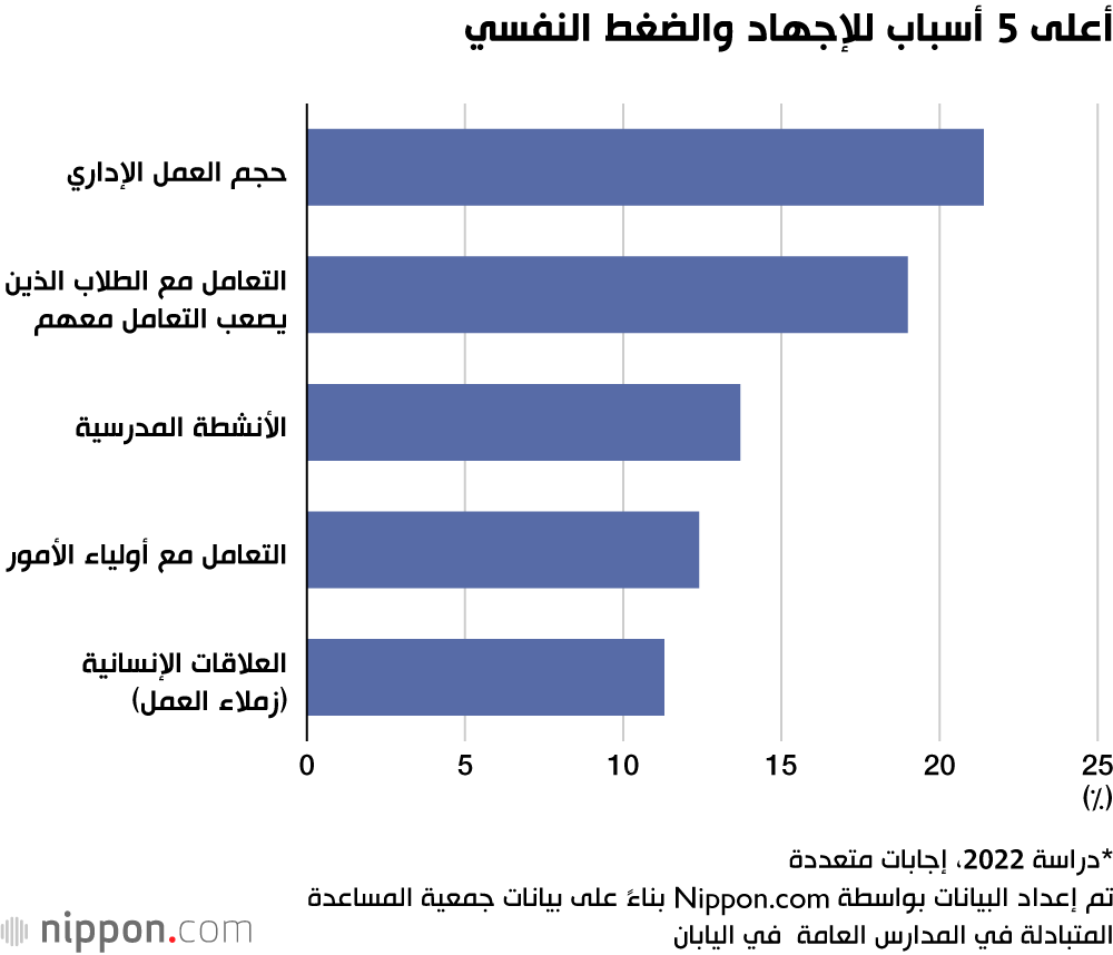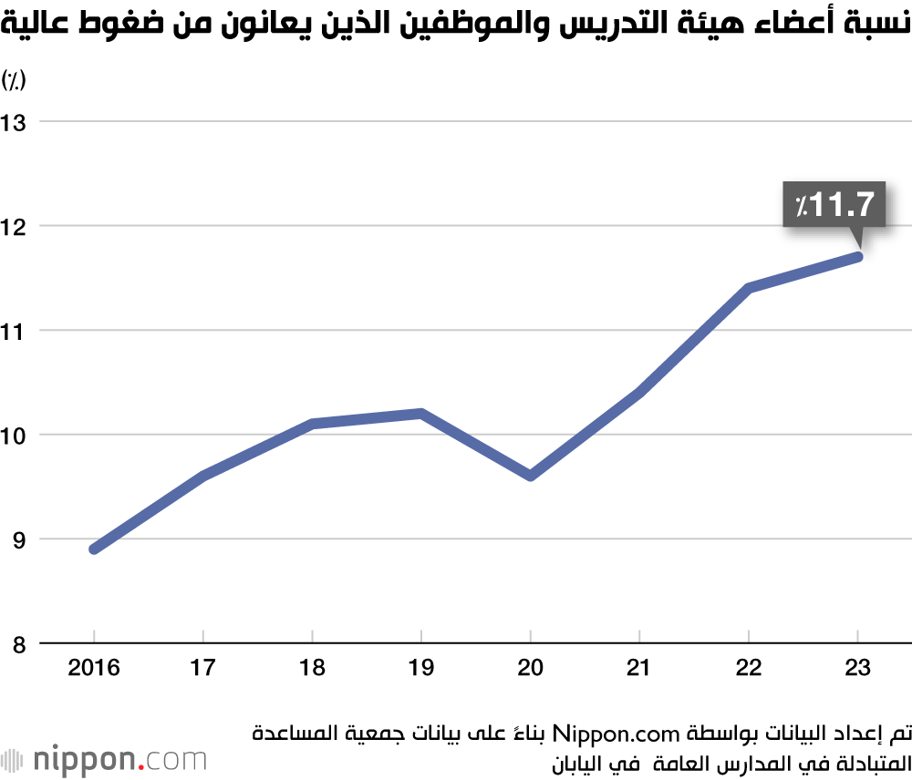 وفقًا لدراسة استقصائية أجرتها جمعية المساعدة المتبادلة في المدارس العامة، والتي شملت معلمين وموظفيين من المدارس الابتدائية والإعدادية والثانوية في جميع أنحاء اليابان، بلغت نسبة المعلمين والموظفين الذين يعانون من ”ضغط مرتفع“ ويُطلب منهم إجراء مقابلات مع طبيب مستوى قياسيًا وصل إلى 11.7% في عام 2023.
