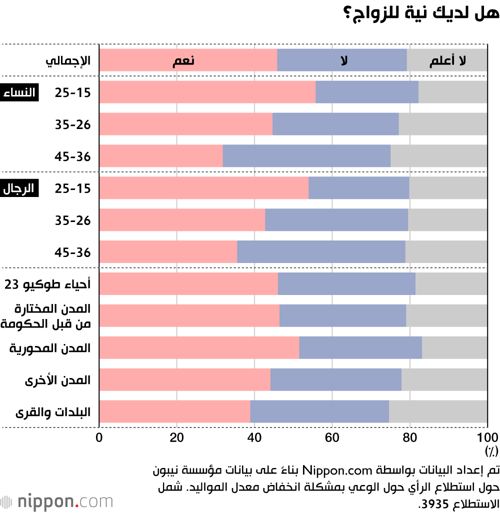 أظهرت دراسة استقصائية أجرتها مؤسسة نيبون في اليابان على 6000 شخص تتراوح أعمارهم بين 15 و45 عاماً، أن حوالي 46% من العازبين أبدوا نية للزواج، وهو ما يمثل زيادة بنسبة 13 نقطة مئوية مقارنة بـ 33% من المستجيبين الذين أفادوا بعدم نيتهم للزواج. ومع ذلك، عندما طُرِحَ سؤال حول احتمالية تحقق هذا الزواج في المستقبل، أجاب فقط 27% منهم بأنهم يتوقعون فعلاً الزواج، بينما اعتقد 39% أنهم لن يتزوجوا، ما يعكس تبايناً كبيراً بين النية والتوقعات الواقعية.