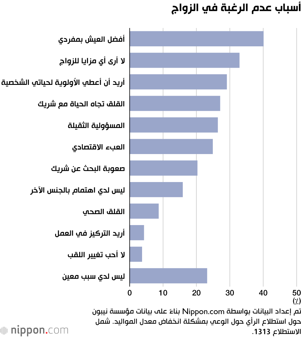 عندما سُئل 1313 شخصًا قالوا إنهم ”لا يريدون الزواج“ عن السبب، كانت الإجابة الأكثر شيوعًا هي أنهم ”يفضلون البقاء عازبين“ بنسبة 40%. تليها الإجابة ”لا أرى أي فوائد“ بنسبة 33%، ثم ”أريد إعطاء الأولوية لحياتي الخاصة“ بنسبة 29%. يشير هذا إلى أن العديد من الأفراد في اليابان أصبحوا أكثر ميلاً لتفضيل الاستقلالية الشخصية على فكرة الزواج التقليدي. هذا التوجه يعكس تغيرات في القيم الاجتماعية حيث يولي العديد من الشباب اليوم اهتمامًا أكبر لتحقيق الذات والتمتع بحرية أكبر في اتخاذ قرارات حياتهم.