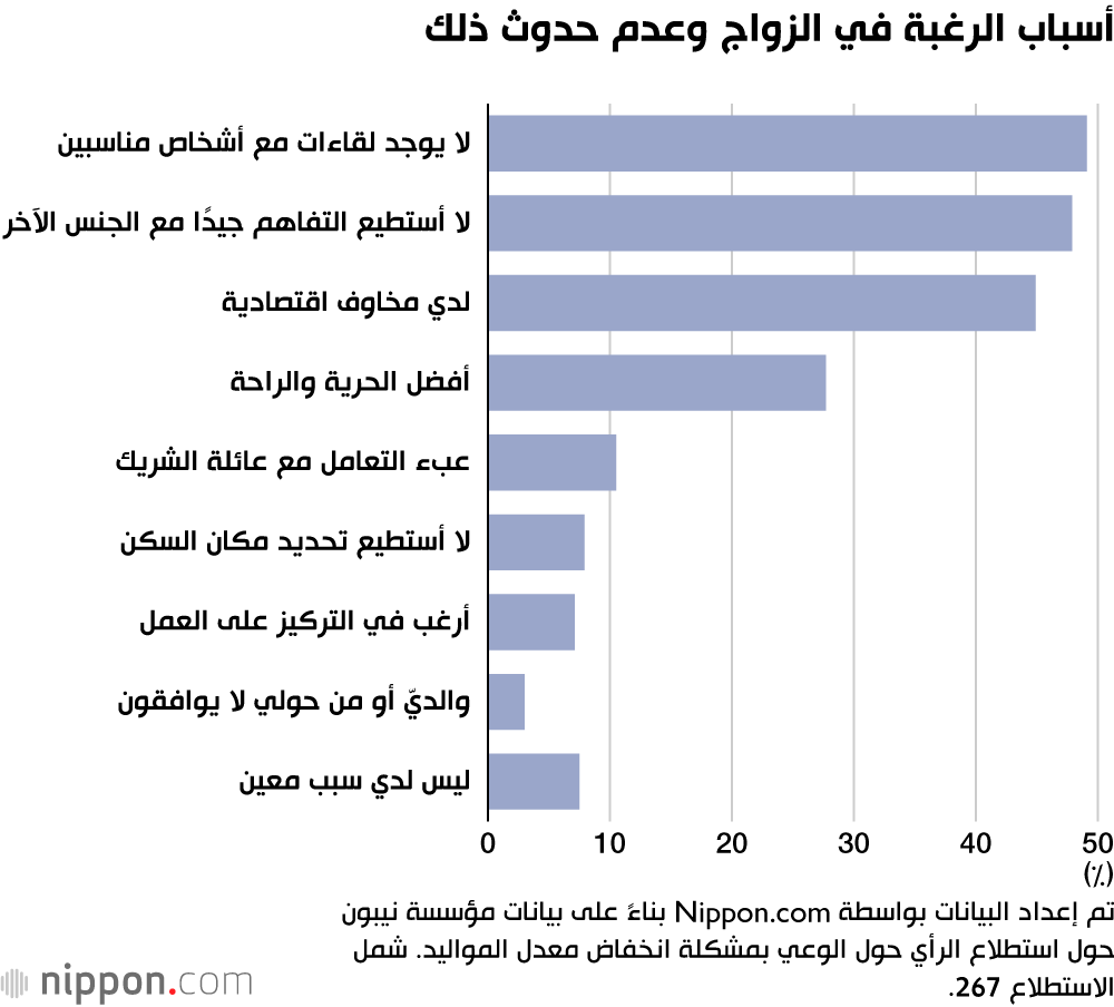 كان السببان الرئيسيان اللذان ذكرهما 267 شخصًا أجابوا بأنهم يريدون الزواج، لكنهم يعتقدون أنهم لن يفعلوا ذلك هما ”عدم وجود فرصة لمقابلة شخص ما“ بنسبة 49% و”عدم القدرة على التوافق مع الجنس الآخر“ بنسبة 48%. تعكس هذه الإجابات تحديات اجتماعية كبيرة تواجه العديد من الأفراد في اليابان، حيث أصبح العثور على شريك حياة مناسب أمرًا صعبًا بسبب نمط الحياة السريع والازدحام السكاني في المدن، مما يقلل من فرص اللقاءات الشخصية العفوية.