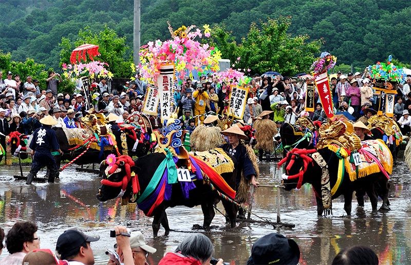 تُقام هذه الطقوس في أول يوم أحد من كل شهر يونيو/حزيران للصلاة من أجل حصاد جيد في كيتاهيروشيما بمحافظة هيروشيما. تزين الماشية بسروج جميلة وتقوم بحرث الحقول وتصطف فتيات من أجل غرس شتلات الأرز.