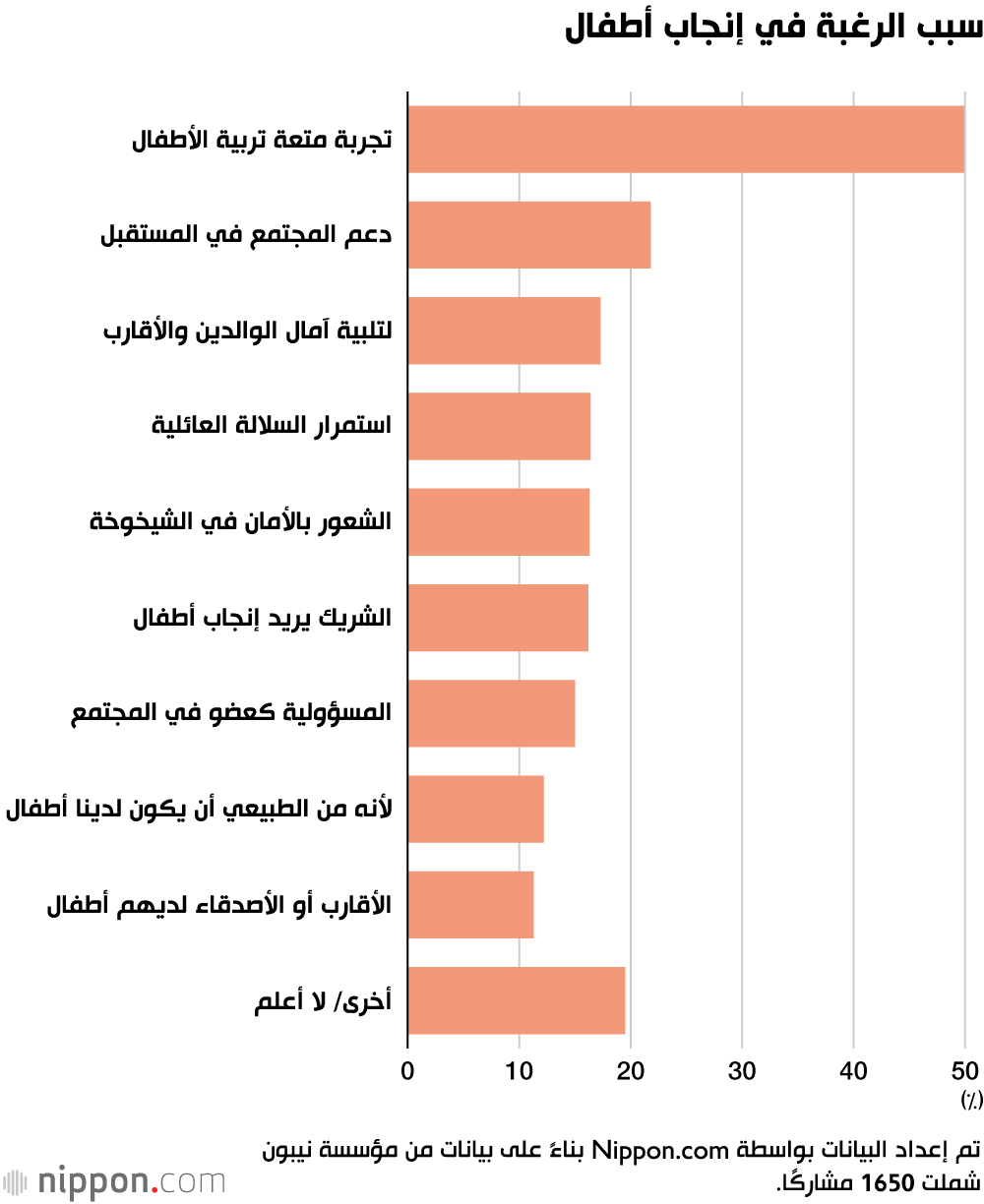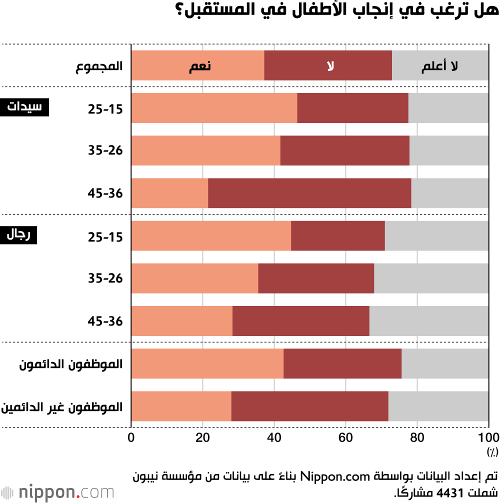 في استطلاع أجرته مؤسسة نيبون وشمل 6000 ياباني تتراوح أعمارهم بين 15 و45 عامًا، عبّر 37٪ من بين 4431 مشاركًا ممن ليس لديهم أطفال عن رغبتهم في الإنجاب، بينما قال حوالي 36٪ إنهم لا يرغبون أو لا يشعرون بأن إنجاب الأطفال أمر ضروري. يهدف هذا الاستطلاع إلى تسليط الضوء على توجهات الرأي العام بشأن أزمة انخفاض معدل المواليد في اليابان.