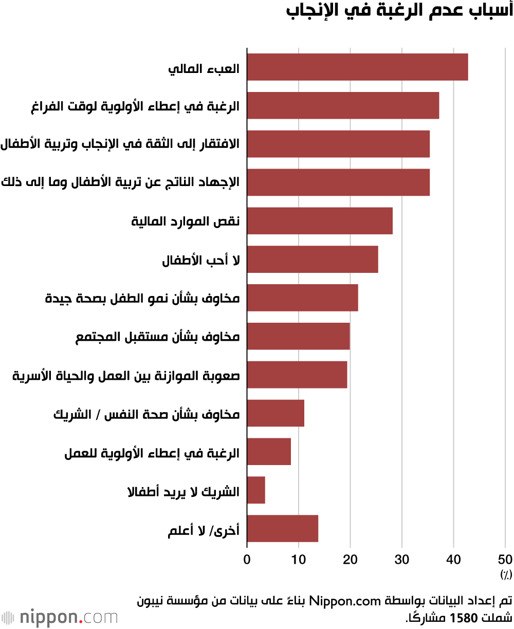 من بين 1580 مستجيبًا الذين أشاروا إلى أنهم لا يرغبون في إنجاب أطفال أو لا يشعرون بأن ذلك ضروري، ذكر 43% منهم ”العبء المالي الكبير“ كسبب رئيسي. وشملت الأسباب البارزة الأخرى ”الرغبة في إعطاء الأولوية لوقت الفراغ“ بنسبة 37%، و”الافتقار إلى الثقة في الإنجاب وتربية الأطفال“ بنسبة 35%، و”الإجهاد الناجم عن تربية الأطفال وغيرها من المسؤوليات“ بنسبة 35%.