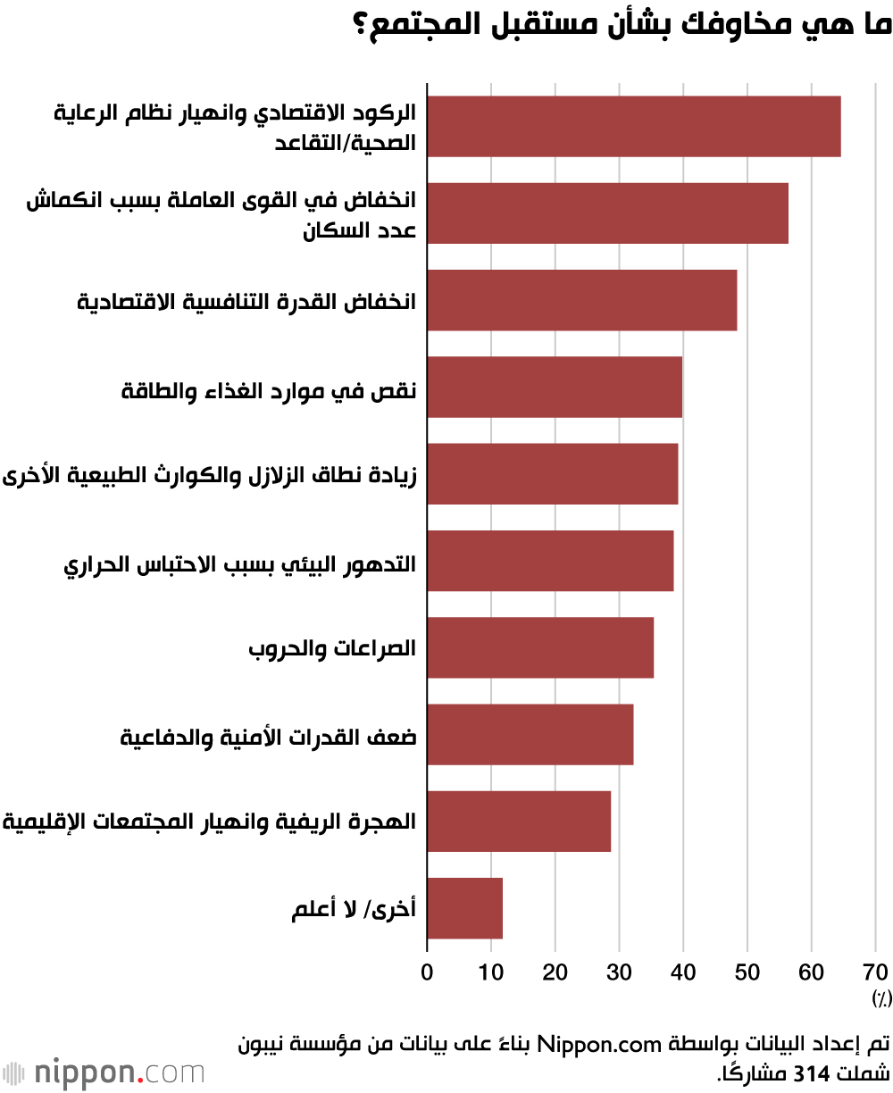 من بين 314 مستجيبًا الذين أشاروا إلى ”المخاوف بشأن مستقبل المجتمع“ كسبب لعدم رغبتهم في إنجاب الأطفال، كان القلق الأكثر شيوعًا هو ”الركود الاقتصادي وانهيار نظام الرعاية الصحية والمعاشات التقاعدية“، والذي أعرب عنه 65٪ من المشاركين. تبع ذلك ”انخفاض القوى العاملة بسبب انكماش السكان“ بنسبة 56٪، و”انخفاض القدرة التنافسية الاقتصادية“ بنسبة 48٪. تعكس هذه المخاوف تأثيرات انخفاض عدد السكان، حيث يؤدي الركود الاقتصادي والاجتماعي الناتج عنه إلى تعزيز هذا الانخفاض، مما يخلق حلقة مفرغة من التأثيرات السلبية المتبادلة.