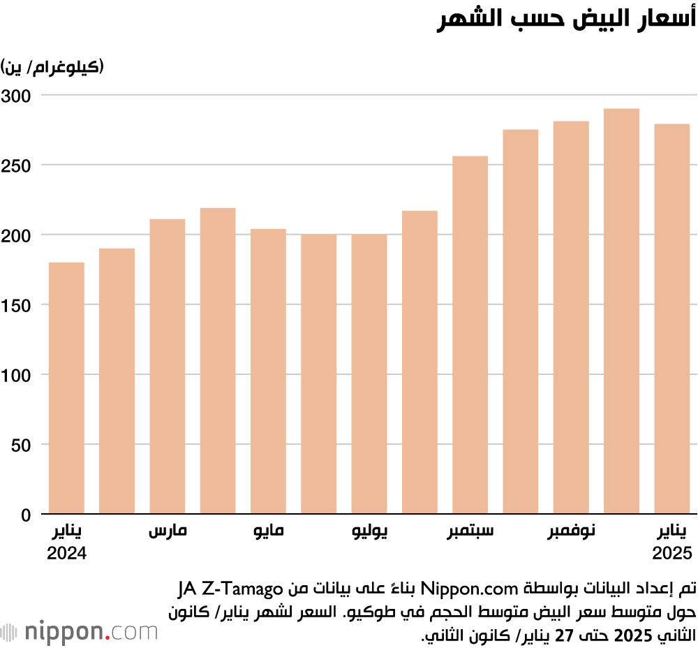أظهر مسح أسعار المواد الغذائية الذي أصدرته وزارة الزراعة والغابات ومصايد الأسماك اليابانية في 21 يناير/ كانون الثاني أن متوسط سعر التجزئة لعبوة من 10 بيضات بلغ 269 ين، وهو أعلى بنسبة 16% مقارنة بالأسعار العادية. ويعكس هذا الارتفاع تأثير تفشي إنفلونزا الطيور، الذي أدى إلى إعدام ملايين الدجاجات البياضة، مما قلل من إمدادات البيض في السوق.