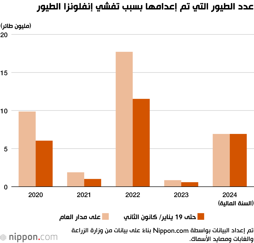 وفقًا لـوزارة الزراعة والغابات ومصايد الأسماك اليابانية، تم تسجيل 43 تفشيًا لإنفلونزا الطيور خلال هذا الموسم (السنة المالية 2024) حتى 24 يناير/ كانون الثاني، وهو ثاني أعلى عدد بعد السنة المالية 2022، التي سجلت أعلى رقم على الإطلاق. ومع ذلك، من حيث عدد الطيور التي تم إعدامها، فإن يناير 2025 يفوق يناير 2023، عندما تم إعدام 4.6 مليون طائر في المجموع.