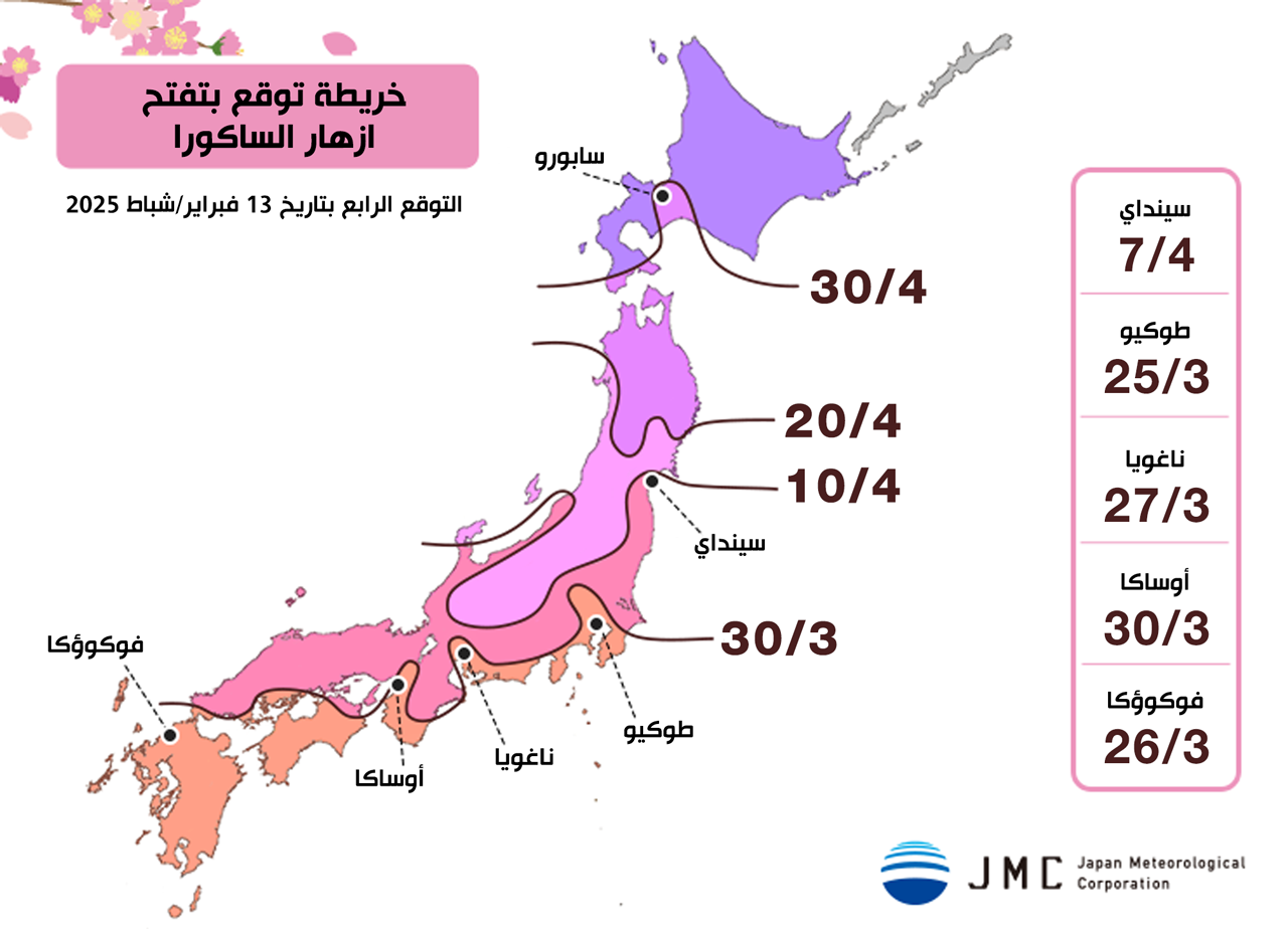 ومن المتوقع أن تشهد طوكيو أولى أزهار الساكورا لهذا العام في 25 مارس/آذار، تليها مناطق كيوشو وشيكوكو. وخلال الفترة الممتدة من أواخر مارس إلى أوائل أبريل/نيسان، ستزهر الأشجار على طول الساحل المطل على المحيط الهادئ غرب منطقة كانتو، قبل أن تمتد موجة التفتح نحو منطقتي هوكوريكو وتوهوكو خلال شهر أبريل/نيسان. أما في هوكايدو، فمن المتوقع أن تصل جبهة تفتح الأزهار إلى الطرف الجنوبي من الجزيرة بحلول نهاية أبريل/نيسان، حيث ستزهر الساكورا في سابورو في 28 أبريل/نيسان، أي بعد نحو شهر من طوكيو، ما يجعلها متزامنة بشكل مثالي مع عطلة الأسبوع الذهبي في اليابان.