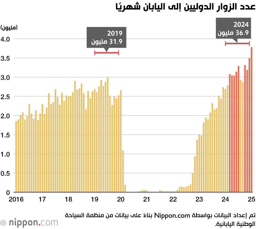 أعلنت منظمة السياحة الوطنية اليابانية أن عدد الزوار الدوليين إلى اليابان في يناير/ كانون الثاني 2025 بلغ 3,781,200، مسجلًا زيادة بنسبة 40.6% مقارنة بالفترة نفسها من العام السابق. وبهذا الرقم، يواصل عدد الزوار تسجيل أرقام قياسية للشهر الثاني على التوالي، بعد أن بلغ 3,489,800 في ديسمبر 2024. كما يعد هذا رابع شهر على التوالي يتجاوز فيه عدد الزوار حاجز 3 ملايين، ما يعكس استمرار الانتعاش السياحي بقوة.