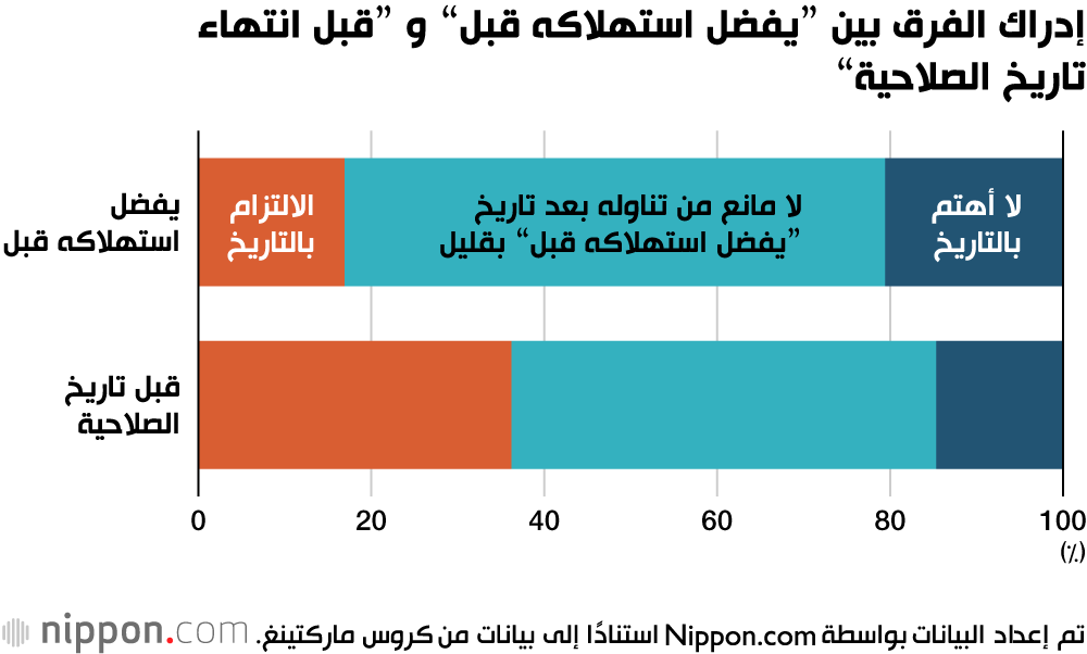 أجرت شركة ”كروس ماركتينغ“ للأبحاث التسويقية في طوكيو استطلاعًا شمل 1100 شخص تتراوح أعمارهم بين 20 و69 عامًا من مختلف أنحاء اليابان. أظهرت نتائج الاستطلاع أن 16.9% من المشاركين يلتزمون دائمًا بتاريخ ”يفضل استهلاكه قبل“ عند استهلاك المنتجات، بينما يولي 36.2% منهم اهتمامًا لتاريخ ”قبل انتهاء تاريخ الصلاحية“. تشير هذه النتائج إلى وجود فهم واضح للفرق بين التواريخ المختلفة. وفيما يتعلق بتاريخ انتهاء الصلاحية، أفاد 62.5% من المشاركين أنهم سيستمرون في تناول الطعام، حتى لو تجاوز تاريخ انتهاء الصلاحية بفترة قصيرة.