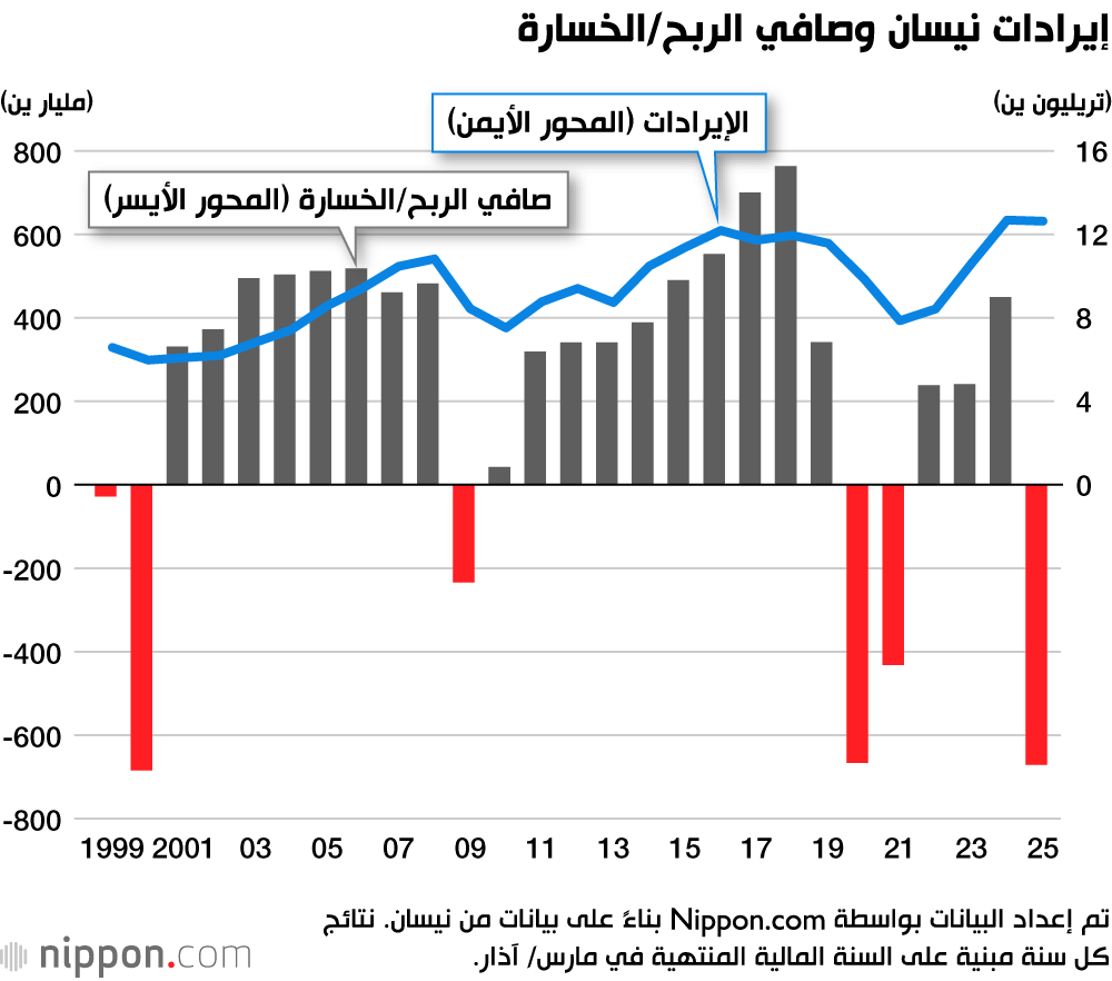 في 13 مايو/ أيار، أعلنت شركة نيسان عن تسجيل خسارة صافية بلغت 671 مليار ين ياباني للسنة المالية المنتهية في مارس/ آذار 2025، في تراجع كبير مقارنةً بأرباح السنة السابقة التي بلغت 427 مليار ين ياباني. وتقترب هذه الخسارة من تلك التي تكبدتها الشركة في السنة المالية المنتهية في مارس/ آذار 2000، والتي بلغت 684 مليار ين ياباني. وظلت إيرادات نيسان المجمعة مستقرة عند 12.6 تريليون ين ياباني. ويعزى ضعف الأداء إلى عدة عوامل، منها تأخر إطلاق الطرازات الجديدة، مما أدى إلى انخفاض المبيعات في الصين والولايات المتحدة، إلى جانب خسائر تجاوزت 500 مليار ين ياباني ناتجة عن إعادة تقييم مصانع الشركة وأصولها في اليابان وحول العالم.