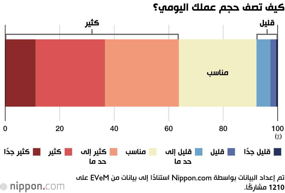 أظهر استطلاع رأي وطني أُجري في اليابان خلال مارس/ آذار 2025، واستهدف المديرين ومديري المستويات المتوسطة، أن 63.7% من المشاركين يرون عبء عملهم اليومي ”ثقيلًا“، حيث وصفه 11.1% بأنه ”ثقيل جدًا“، و25.5% ”ثقيل“، و27.1% ”ثقيل نسبيًا“. كما أفاد 60% من المشاركين بأن عبء عملهم ”زاد“. أجرى الاستطلاع شركة EVeM، المتخصصة في تقديم خدمات الدعم الإداري للشركات.