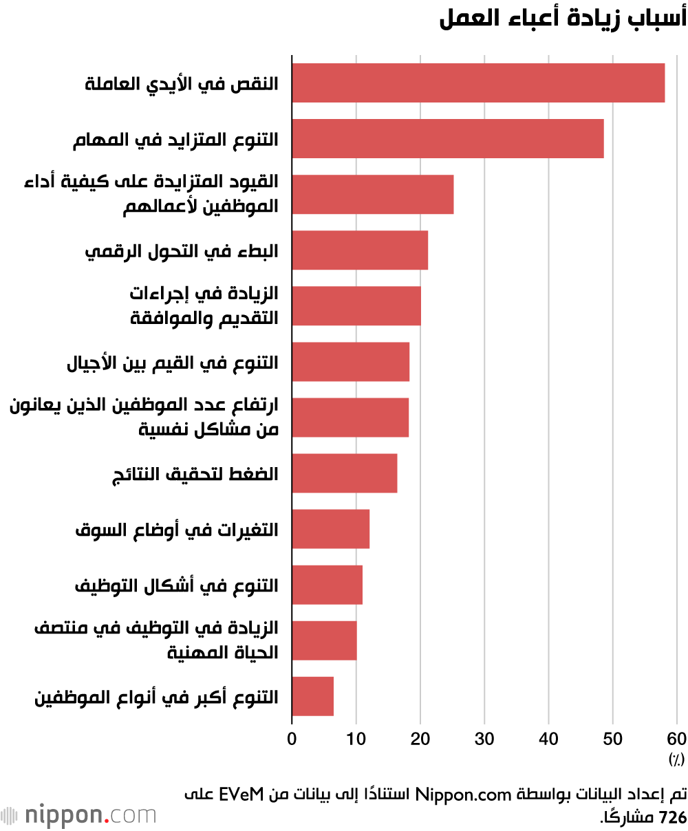 الأسباب الرئيسية لتفاقم أعباء العمل شملت ”نقص العمالة“ بنسبة 58.1%، و”زيادة تنوع المهام“ بنسبة 48.6%، تلاها ”تشديد القيود على أساليب العمل، مثل الأوقات والموقع“ بنسبة 25.2%. وتُظهر هذه النتائج أن توسّع نطاق الحرية في أساليب العمل، كالعمل عن بُعد، قد أصبح مصدر عبء إضافي على المديرين المسؤولين عن تنظيمه.