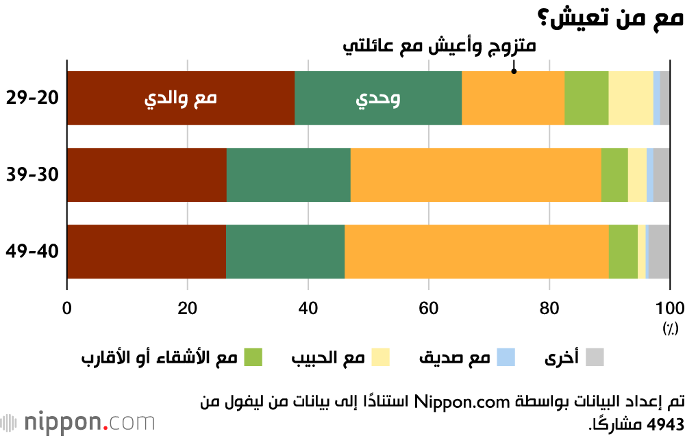 أظهر استطلاع أجرته شركة ليفول، المزودة لخدمات المعلومات العقارية، أن نسبة كبيرة من سكان منطقة طوكيو الحضرية ممن تتراوح أعمارهم بين 20 و49 عامًا لا يزالون يعيشون في منازل أسرهم.
