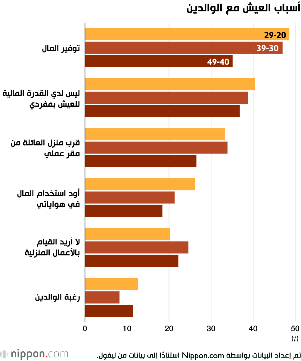 السبب الرئيسي لاستمرار المشاركين في العشرينيات والثلاثينيات من العمر في العيش مع والديهم، بنسبة 48.6% و47.0% على التوالي، كان رغبتهم في توفير المال. أما بالنسبة للأشخاص في الأربعينيات من العمر، وبنسبة 36.8%، فكان السبب الأكثر شيوعًا هو افتقارهم إلى الإمكانيات المالية للانتقال للعيش بمفردهم. وهذا يشير إلى أن العديد من الأفراد في جميع الفئات العمرية كانوا يختارون العيش مع والديهم لأسباب مالية.