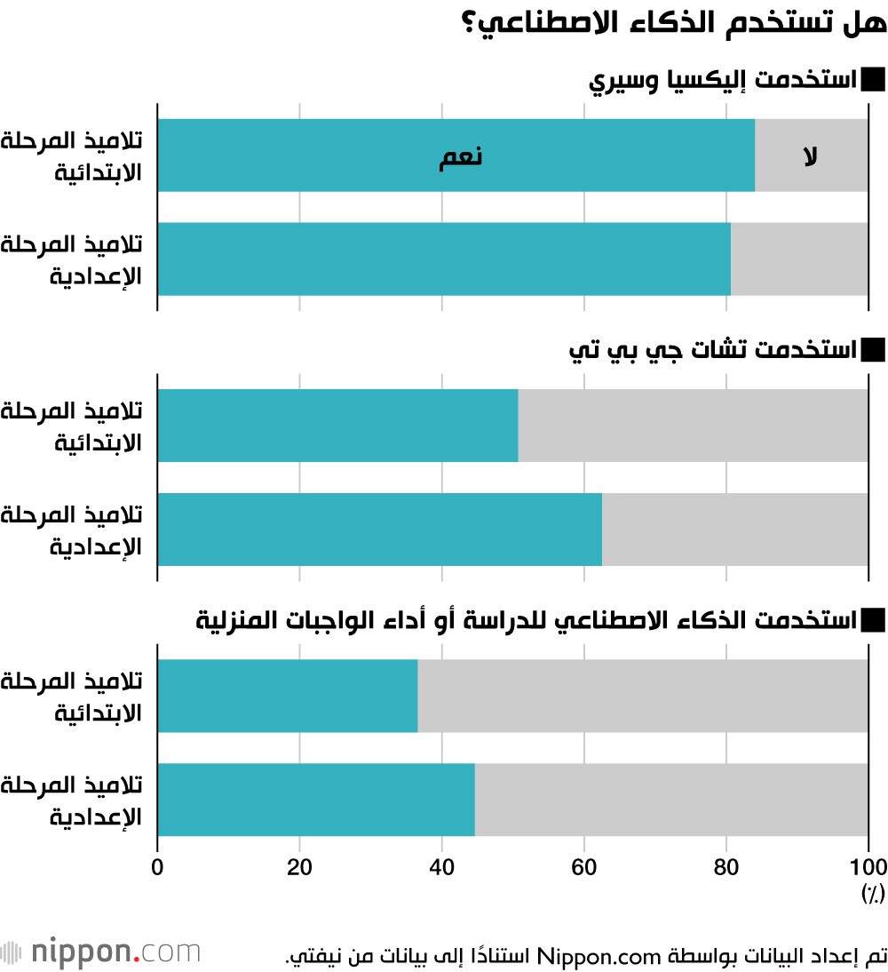 كشفت دراسة أجرتها شركة نيفتي، مزود خدمة الإنترنت في اليابان، عن انتشار واسع لاستخدام الذكاء الاصطناعي بين الأطفال. أجريت الدراسة عبر موقع نيفتي كيدز بين مارس/ آذار وأبريل/ نيسان 2025، وشملت 1430 استجابة من تلاميذ المرحلة الابتدائية والإعدادية. أظهرت النتائج أن 84% من تلاميذ المرحلة الابتدائية و80.4% من تلاميذ المرحلة الإعدادية استخدموا مساعدين رقميين مثل أليكسا وسيري، المعرفين في الدراسة كأدوات ذكاء اصطناعي، مما يعكس سهولة الوصول إلى هذه التقنيات واندماجها في حياتهم اليومية.