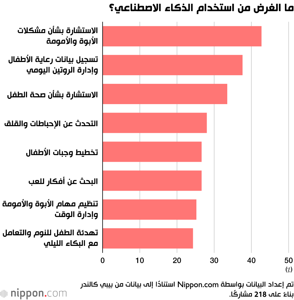 كان الاستخدام الأكثر شيوعًا هو ”الاستشارة بشأن مشكلات الأبوة والأمومة“، حيث أشار إليها 42.7% من المشاركين. على وجه الخصوص، استخدم الآباء الذكاء الاصطناعي عند مواجهة قضايا يصعب مناقشتها مع الآخرين، مثل تأديب الأطفال، أو نموهم، أو التعامل مع سنوات الطفولة الصعبة. هذه الأنواع من المشكلات قد تكون صعبة الحل داخل الأسرة بمفردها.