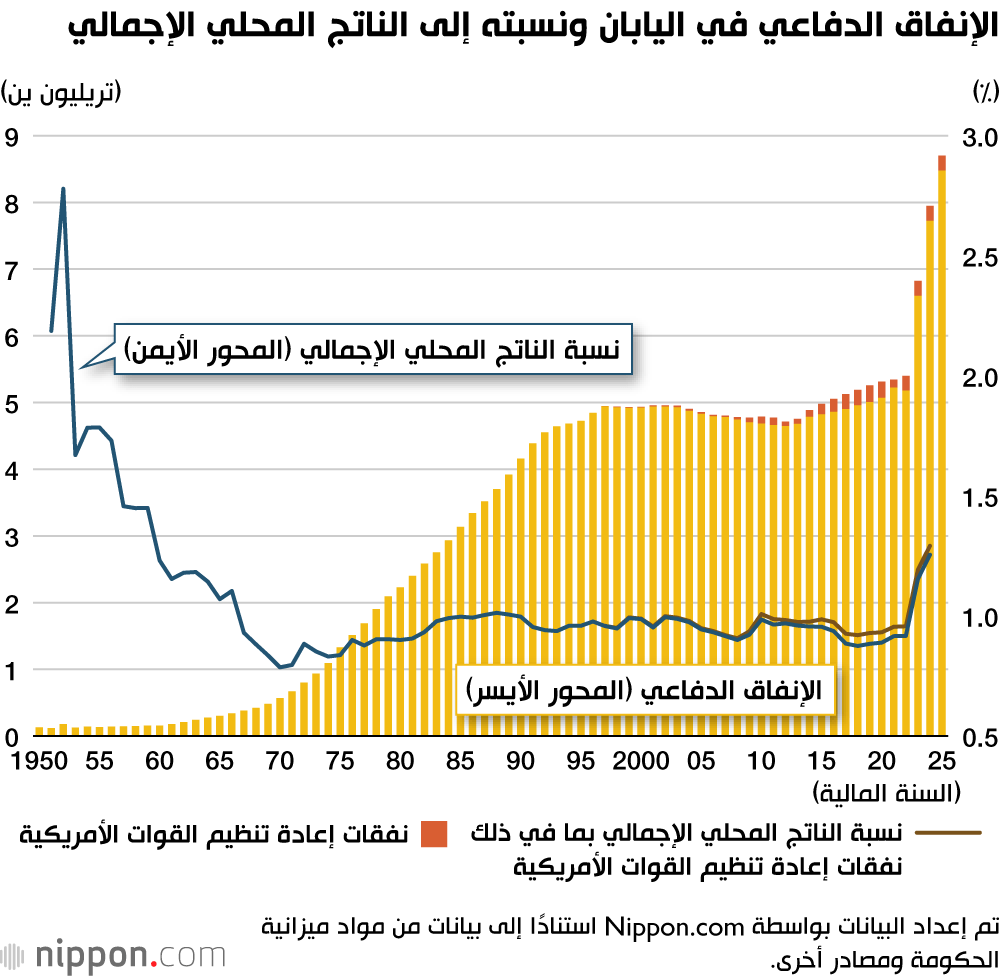 في عام 1976، قرر رئيس الوزراء ميكي تاكيو تحديد سقف للإنفاق الدفاعي في اليابان عند 1% من الناتج القومي الإجمالي كإجراء للحد من التسلح. وعلى الرغم من أن إدارة رئيس الوزراء ناكاسوني ياسوهيرو ألغت هذا الحد الرسمي في عام 1987، ظل هذا المفهوم غير المعلن قويًا (كنسبة مئوية من الناتج المحلي الإجمالي منذ السنة المالية 1993). يتضح ذلك من الرسم البياني أدناه.
