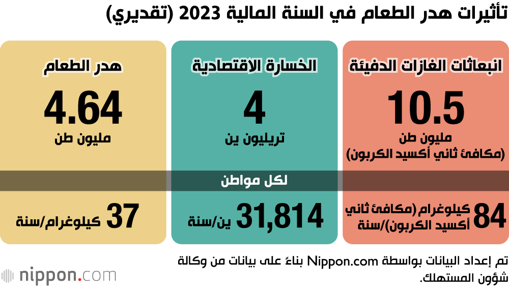 بلغت مستويات هدر الطعام في السنة المالية 2023 خسائر اقتصادية بقيمة 4 تريليونات ين وانبعاثات كربونية بمقدار 10.5 مليون طن (محولة إلى مكافئ ثاني أكسيد الكربون). وهذا يعادل 31,814 ين و84 كيلوغرامًا من انبعاثات ثاني أكسيد الكربون لكل مواطن.