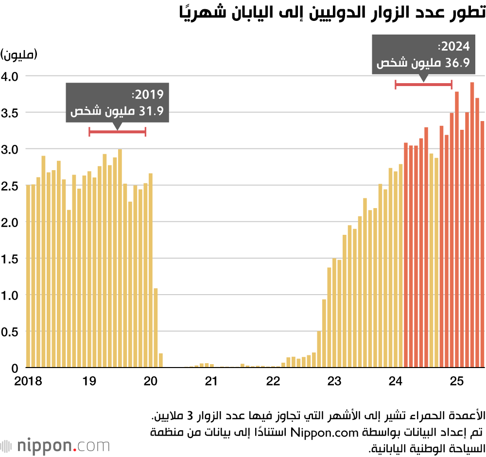 استقبلت اليابان 20 مليون زائر دولي في النصف الأول من عام 2025، وهو أسرع وقت للوصول إلى هذا العدد على الإطلاق. بلغ إجمالي الزوار 21,518,100 حتى نهاية يونيو.