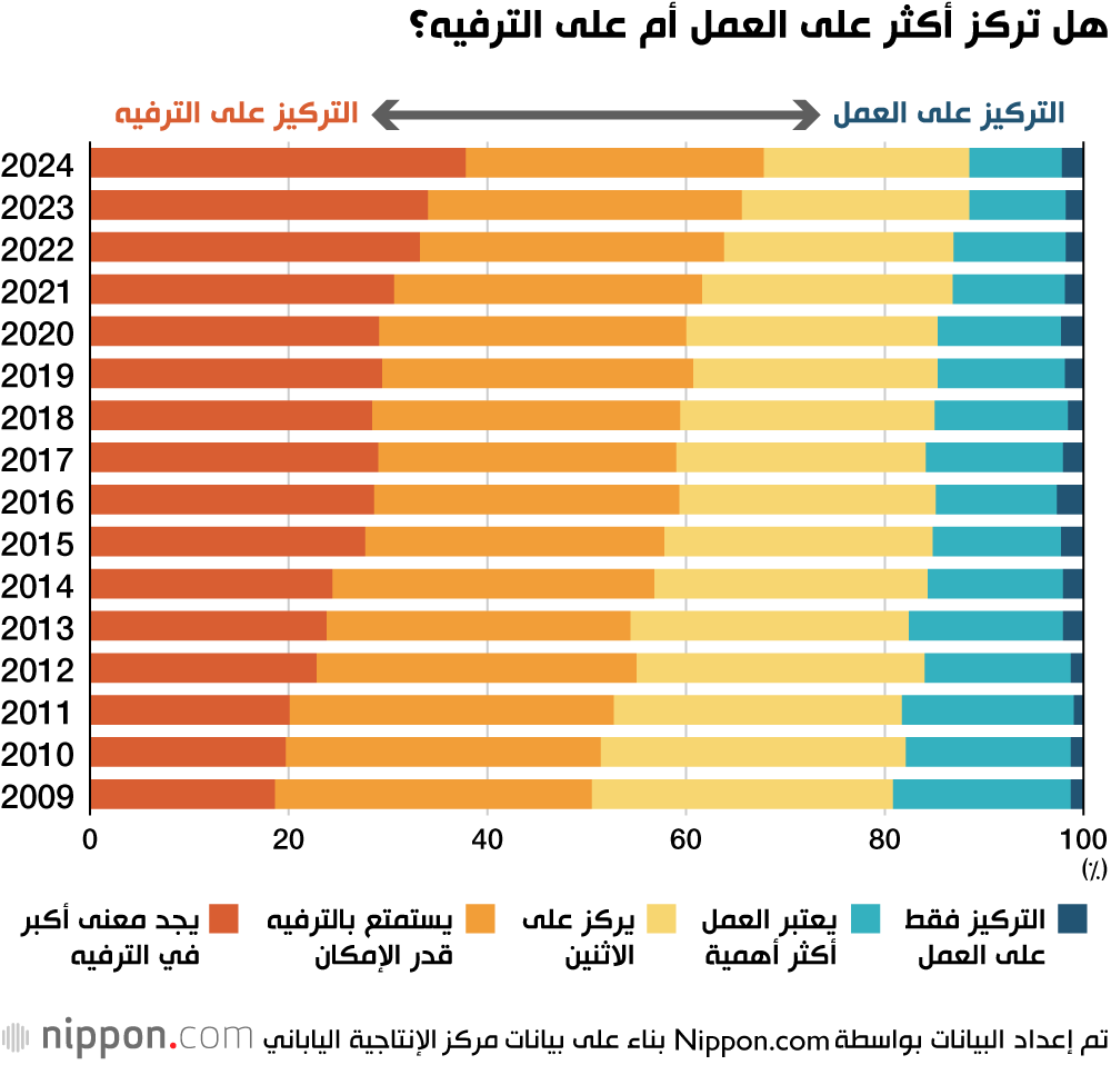 عند سؤال المشاركين عن أولوياتهم بين العمل والترفيه، أجاب 37.8% بأنهم ”يجدون معنى أكبر في الترفيه مقارنة بالعمل“، بينما قال 30.0% إنهم ”ينجزون العمل بسرعة للاستمتاع بوقت الترفيه قدر الإمكان“، مما يعني أن 67.8% يرون الترفيه أكثر أهمية. هذه النسبة هي الأعلى منذ بدء جمع هذه الإحصاءات في 2009، مما يعكس تحولًا في القيم الاجتماعية نحو تقدير الترفيه. في المقابل، أشار 20.7% إلى أنهم ”يوازنون بين العمل والترفيه“، بينما قال 9.3% إنهم ”يستمتعون أحيانًا بالترفيه، لكنهم يركزون أكثر على العمل“.