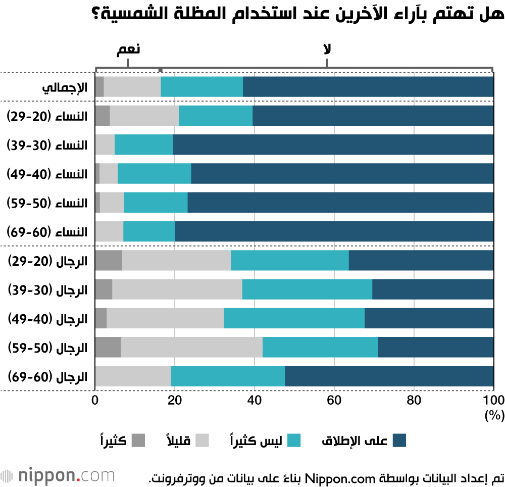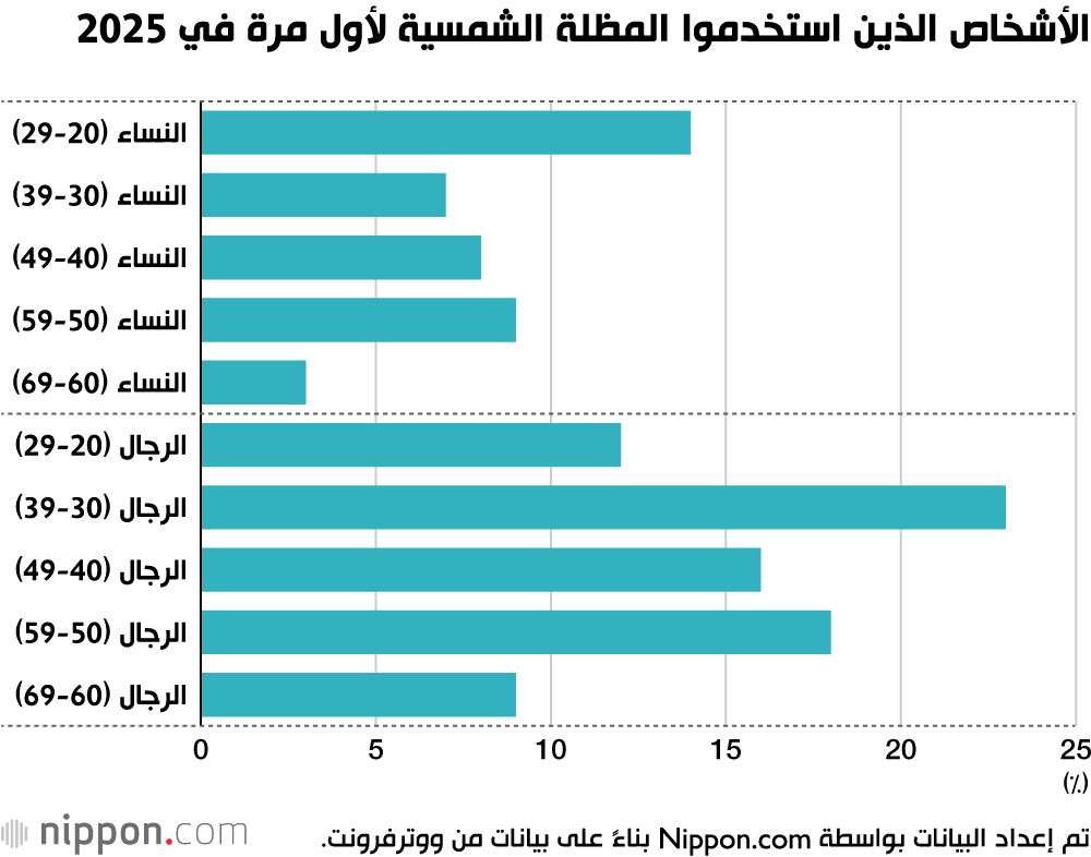 ونظرًا لأن استخدام المظلات كان شائعًا بالفعل بين النساء، فإن نسبة من استخدموها لأول مرة في عام 2025 كانت منخفضة. ومع ذلك، يبدو أن العديد من الرجال يستخدمون المظلات لأول مرة بسبب الحرارة الشديدة مؤخرًا.