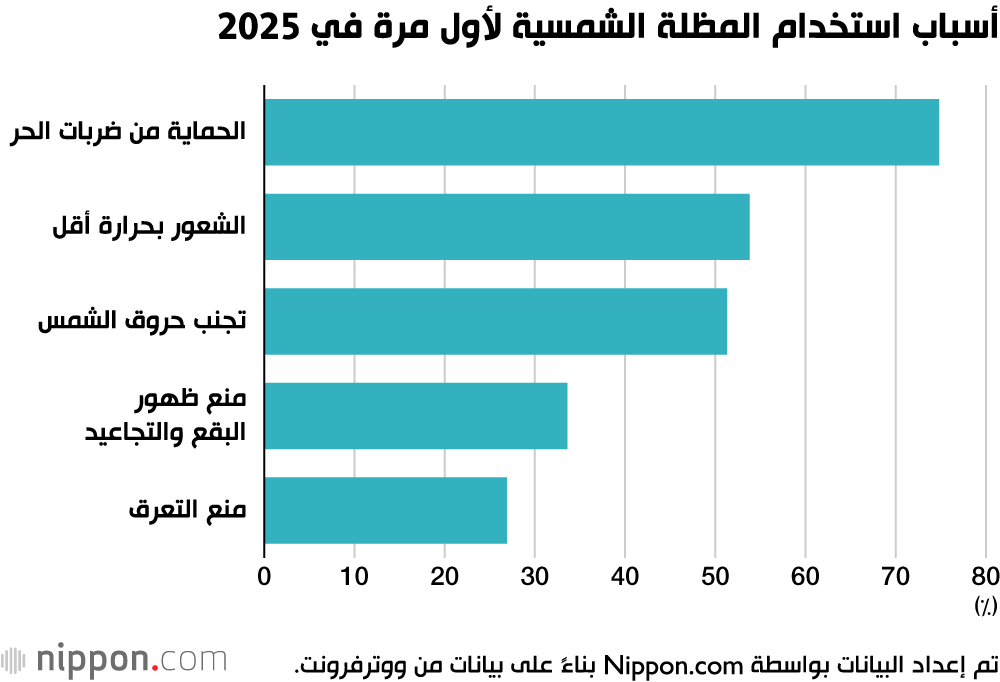 كان السبب الأكثر شيوعًا لاستخدام المظلة لأول مرة، والذي ذكره 74.8% من المشاركين، هو الوقاية من ضربة الحر، متجاوزًا بكثير نسبة 51.4% التي أرادت تجنب حروق الشمس. وهذا يشير إلى ارتباط متزايد بين السلامة والراحة.