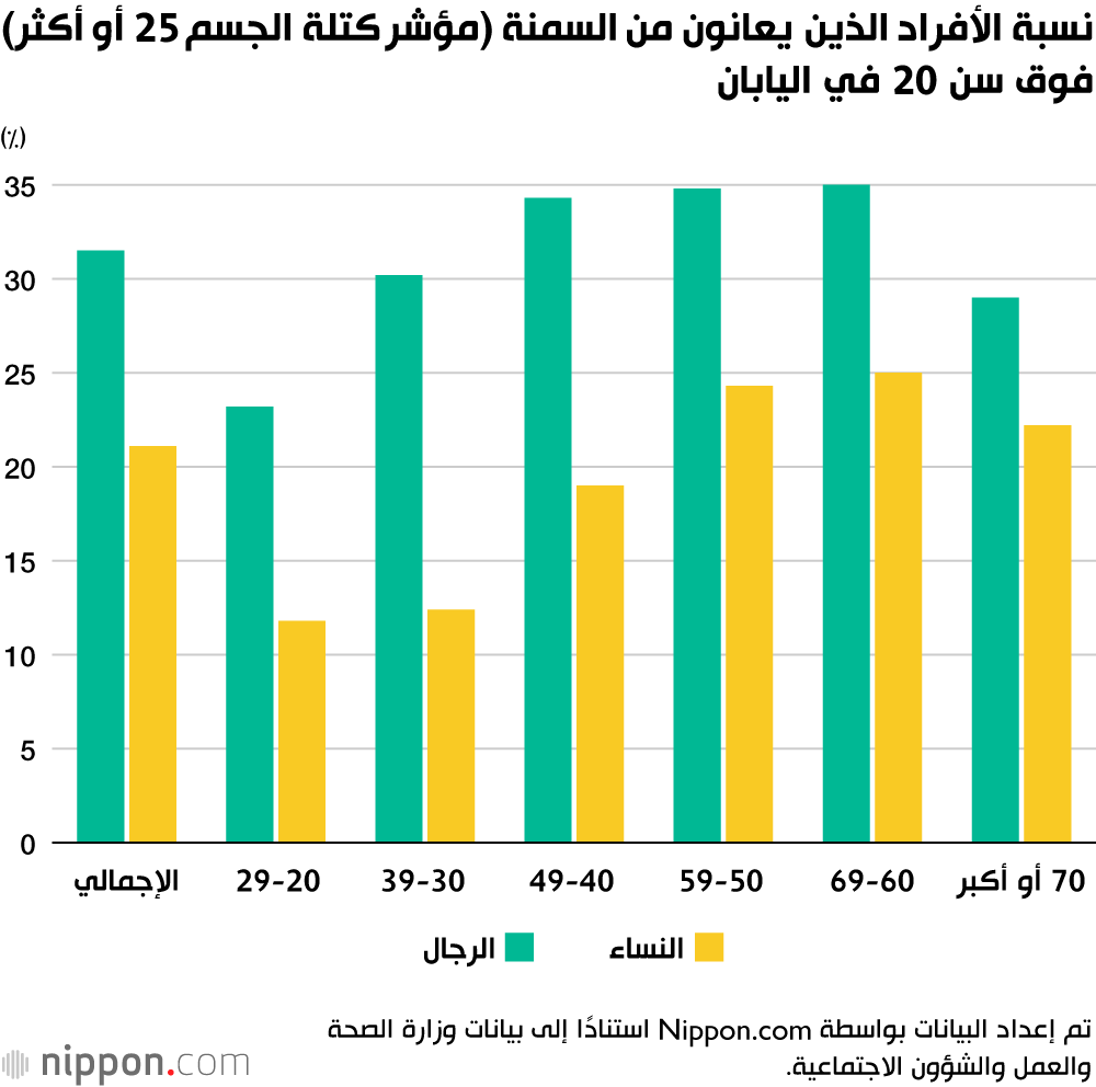 وفقًا للمسح الوطني للصحة والتغذية لعام 2023، الذي أجرته وزارة الصحة والعمل والشؤون الاجتماعية، بلغت نسبة الأفراد الذين يعانون من السمنة (مؤشر كتلة الجسم 25 أو أكثر) بين من تزيد أعمارهم على 20 عامًا نحو 31.5٪ لدى الرجال و21.1٪ لدى النساء. وتزداد هذه النسبة مع التقدم في العمر، إذ يُصنّف 35٪ من الرجال و25٪ من النساء في الستينيات من العمر على أنهم يعانون من السمنة.