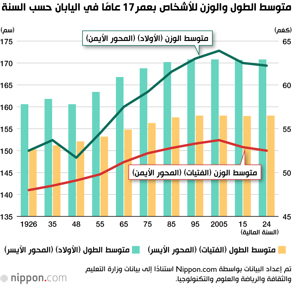 تُظهر إحصاءات وزارة التعليم والثقافة والرياضة والعلوم والتكنولوجيا اليابانية (MEXT) أن متوسط طول الفتيان في سن السابعة عشرة ارتفع من 160.6 سنتيمترًا عام 1926 إلى 170.8 سنتيمترًا عام 2024، أي بزيادة قدرها 10.2 سنتيمترات. كما ارتفع متوسط طول الفتيات في العمر نفسه من 150.3 سنتيمترًا إلى 158.0 سنتيمترًا خلال الفترة ذاتها، بزيادة 7.7 سنتيمترات. وتحتفظ الوزارة بسجلات سنوية لمتوسط طول ووزن طلاب المدارس منذ عام 1900، باستثناء الفترة ما بين 1940 و1947.