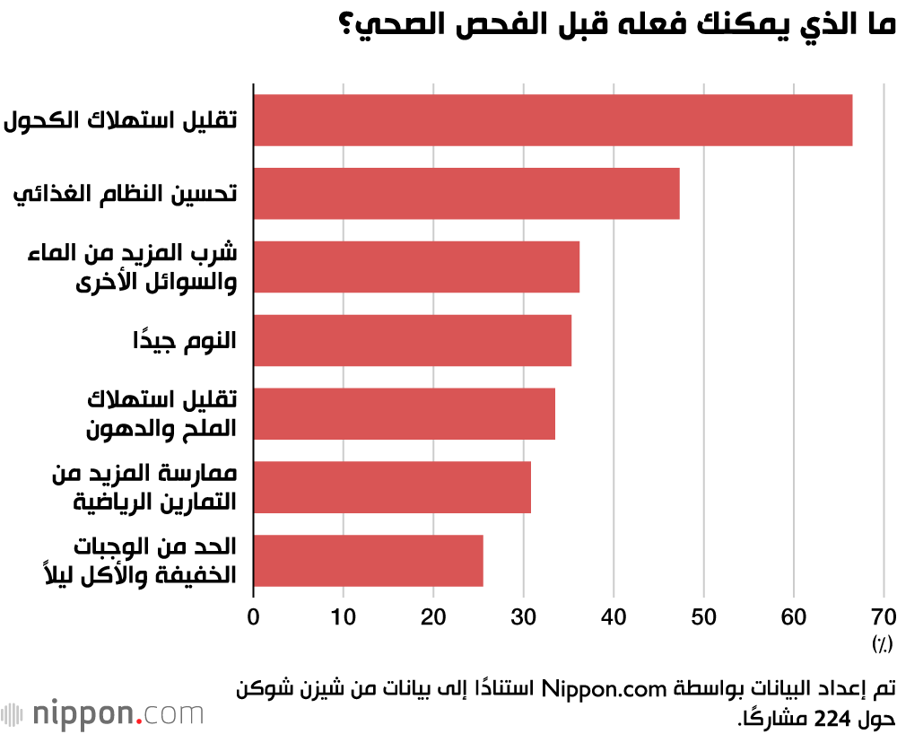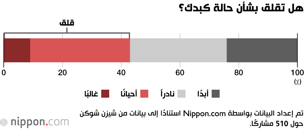 أجرت شركة ”شيزن شوكن“ اليابانية للأغذية الصحية استطلاعًا شمل 510 رجال ونساء تتراوح أعمارهم بين 20 و69 عامًا ممن يشربون الكحول بانتظام، وذلك لمعرفة المزيد عن حالتهم الصحية قبل إجراء الفحوصات الطبية الشاملة. وخلص الاستطلاع إلى أن 43% من المشاركين كانوا قلقين بشأن حالة الكبد، حيث قال 9% إنهم يقلقون بشأنها ”كثيرًا“ و34% ”أحيانًا“.