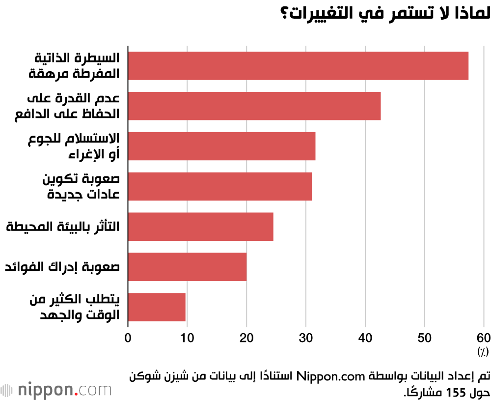 ومن الأسباب التي ذُكرت لقلة المثابرة ما يلي: ”الإفراط في ضبط النفس مُرهِق“ (57.4%)، ”عدم القدرة على الحفاظ على التحفيز“ (42.6%)، ”الاستسلام للجوع أو الإغراء“ (31.6%)، ”الانشغال بالعمل أو الحياة اليومية يمنعهم من تكوين عادات جديدة“ (31.0%)، ”التأثر بالبيئة المحيطة بسهولة عند تناول الطعام في الخارج، أو حضور حفلات الشرب، أو تناول الطعام مع أفراد الأسرة“ (24.5%). وُرد العديد من الأسباب، ولكن يبدو أن الناس مُتساهلون مع أنفسهم أكثر من اللازم.
